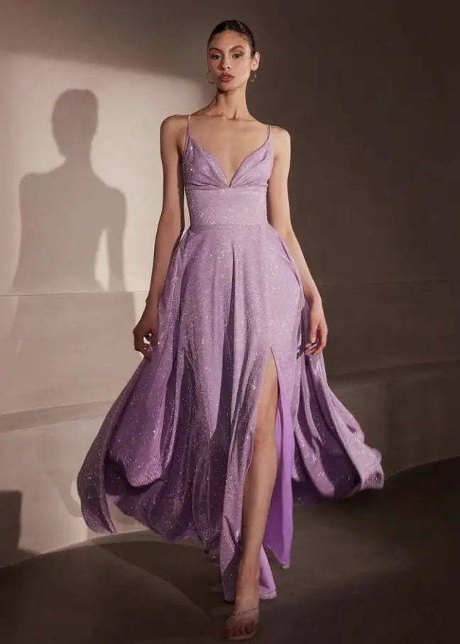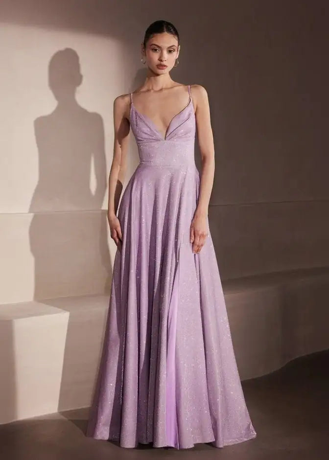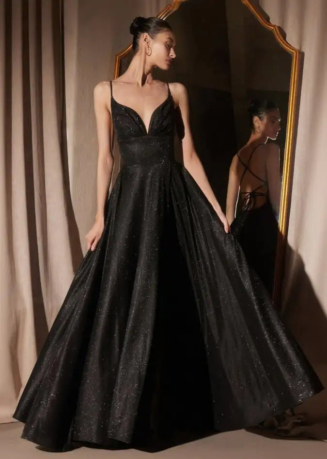 Radiate in every direction with this iridescent A-line A-Line Sparkling Ball Dress with Lace up Back. The softly draped bodice features a flattering neckline and delicate spaghetti straps that lead into a romantic lace-up back. The shimmering full skirt flows into a structured silhouette complete with hidden pockets. Perfect for twirling the night away. Fully lined for comfort, this dress delivers glamour without the need for an interior corset. Ideal for proms, school balls, or formal evening events.