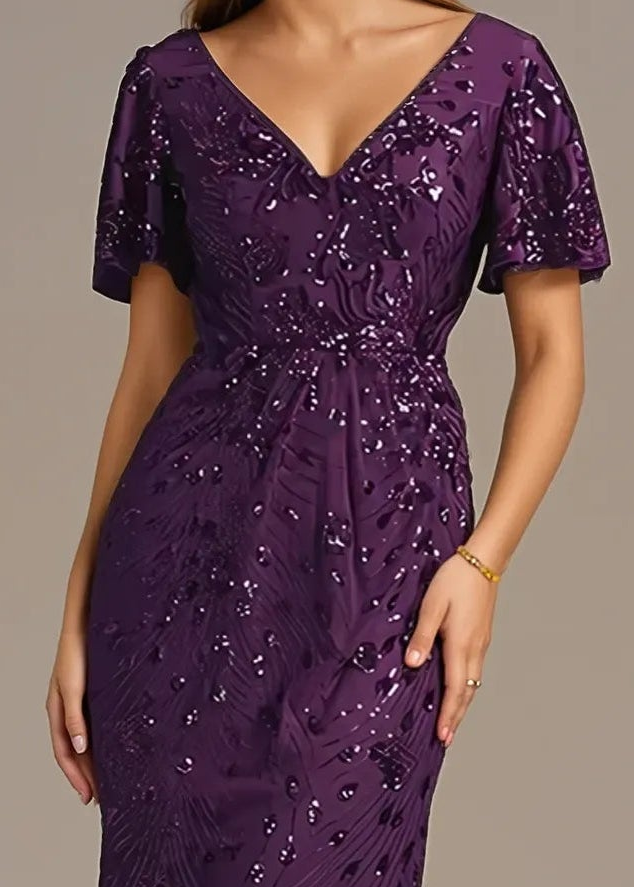 Elevate your special occasion with the Dora Midi Sequin Mother of the Bride/Groom Dress. Featuring delicate floral sequins that shimmer with every movement, this dress combines elegance and charm. The romantic ruffled sleeves enhance its graceful appeal, while the flattering mermaid silhouette highlights your natural curves. Designed for both comfort and style, it’s perfect for weddings, cocktail parties, and memorable events. Make a stunning impression in this timeless, high-quality gown. This gown is lined, Is without bust padding.  It has a high back, so a bra can be worn with it. It also has a concealed zip at the back.