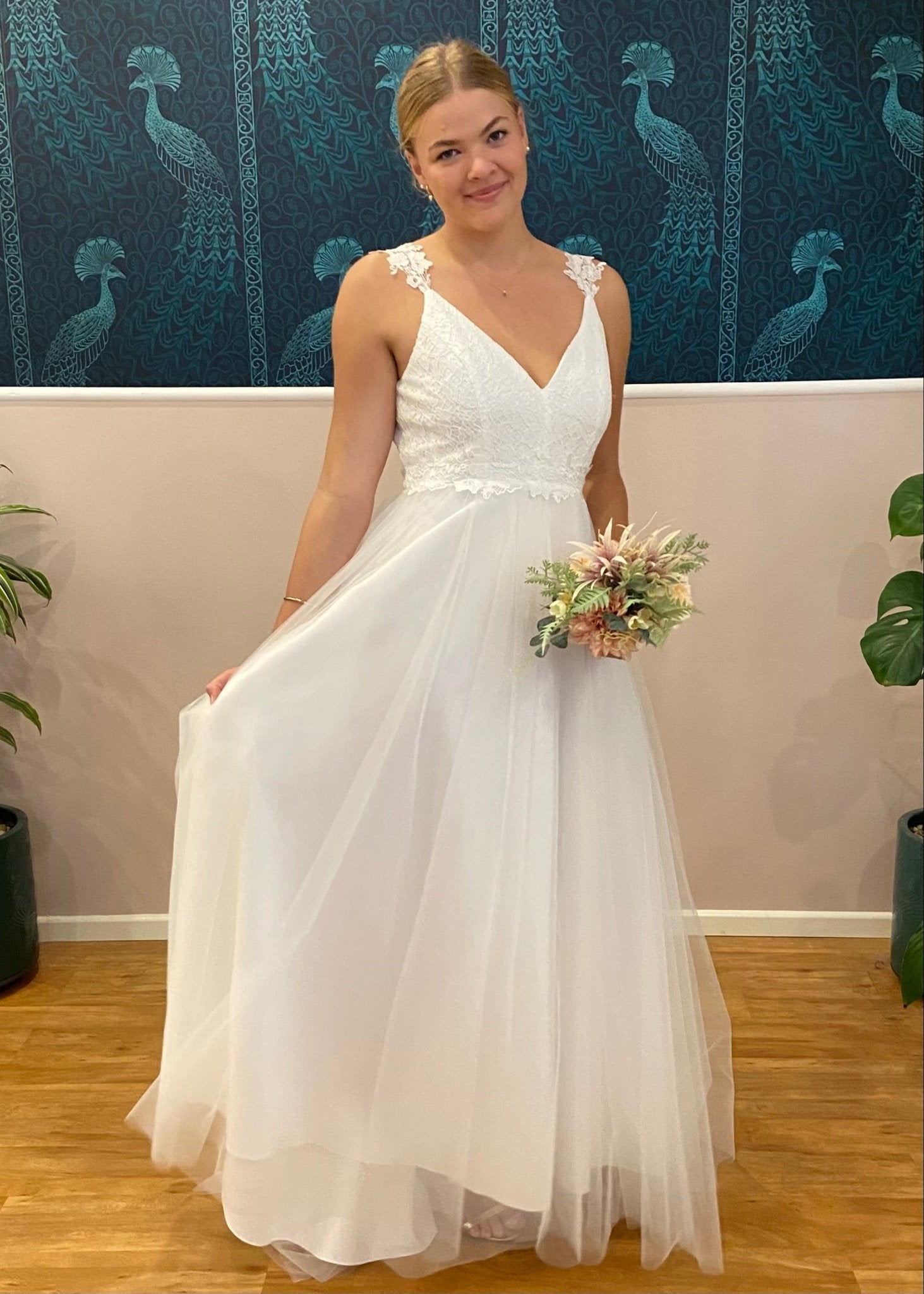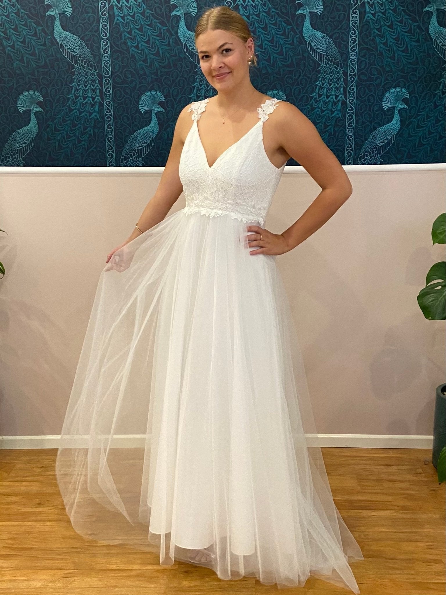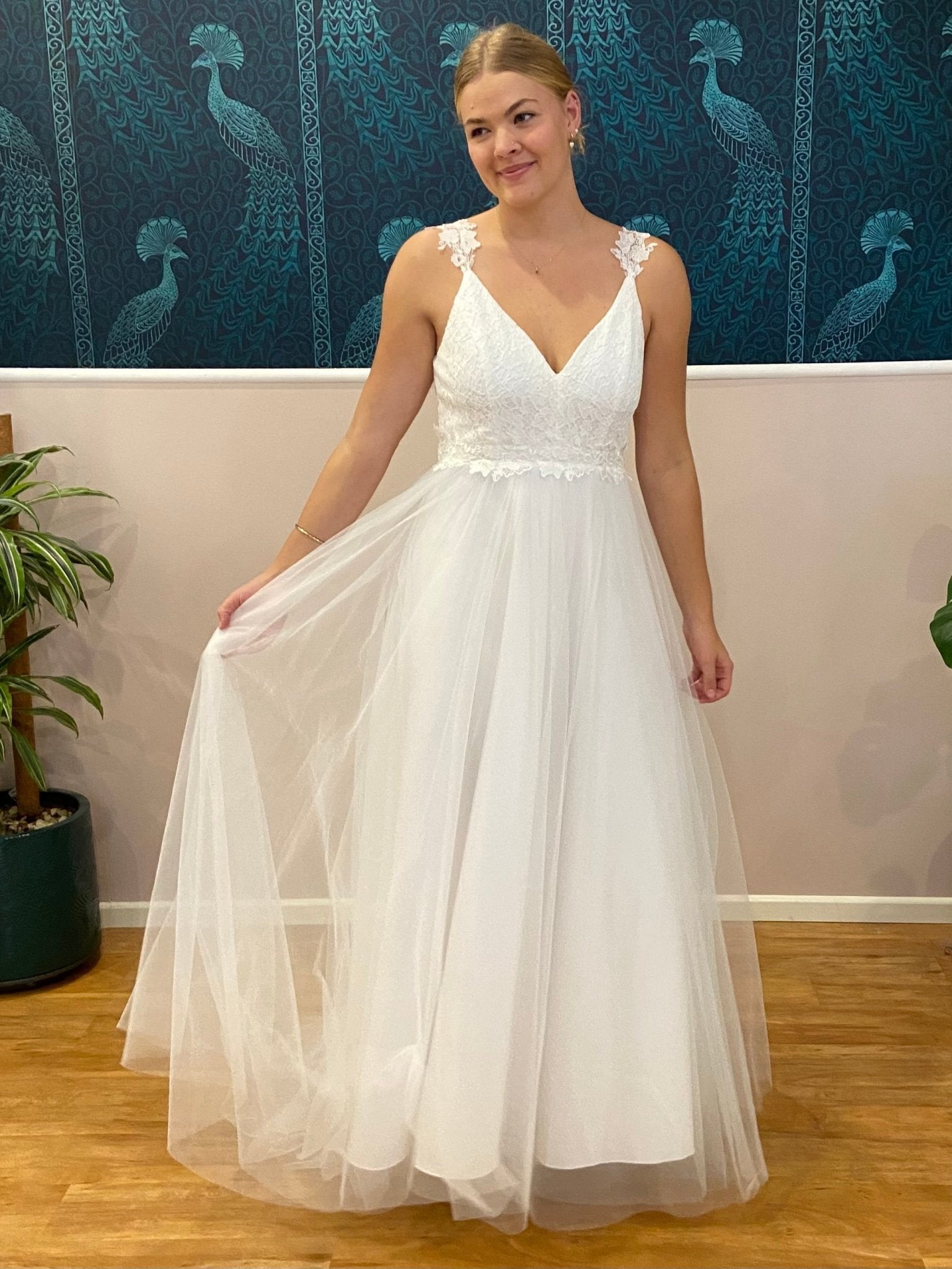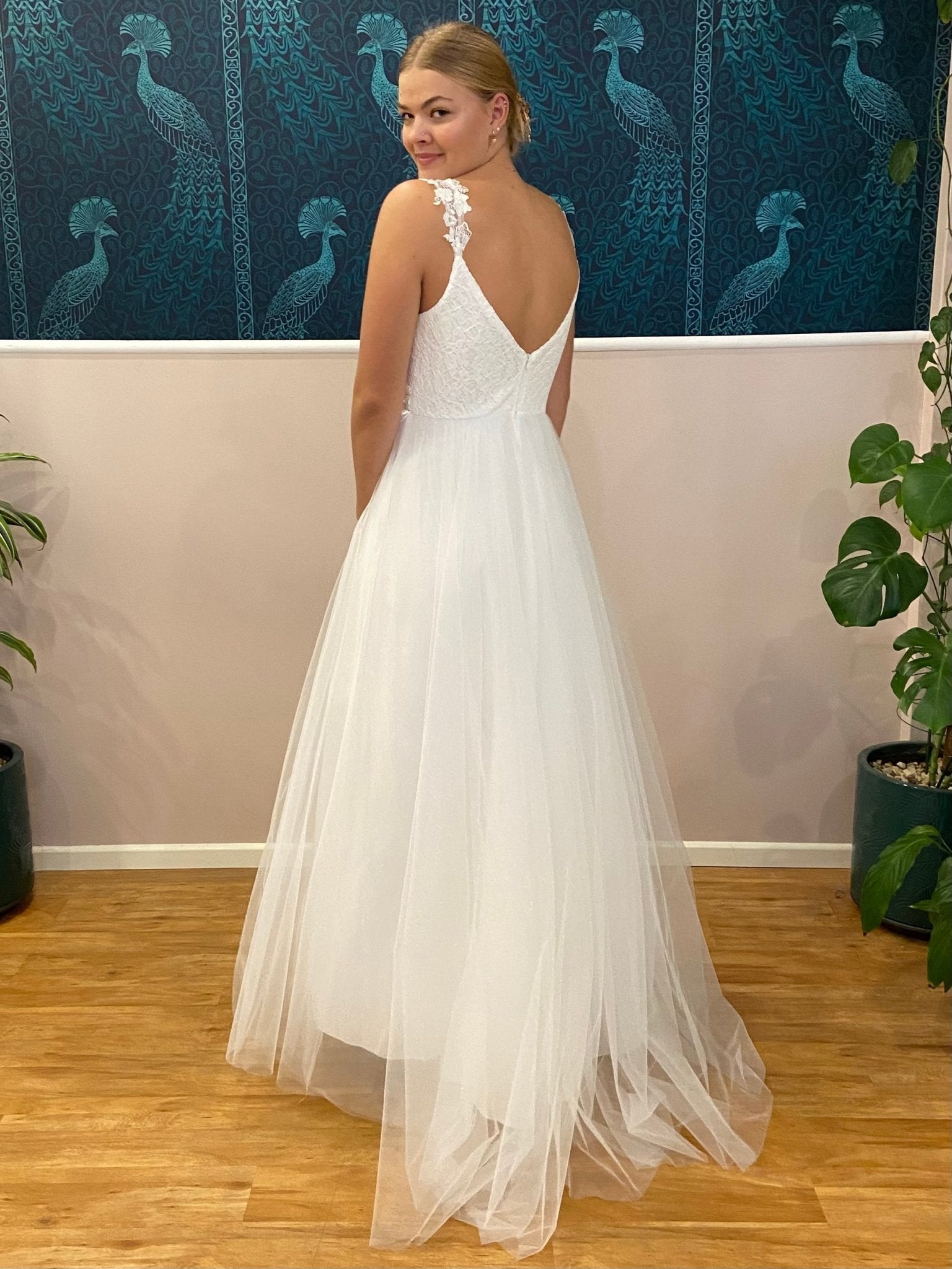 Introducing the Elizabeth Tulle Wedding Dress with a lace bodice and straps. Create your moment with the Elizabeth Double V-Neck Wedding Dress in elegant ivory — a stunning bridal gown crafted to combine timeless romance and modern silhouette. This gown can also be ordered under our 'buy to try' offer.