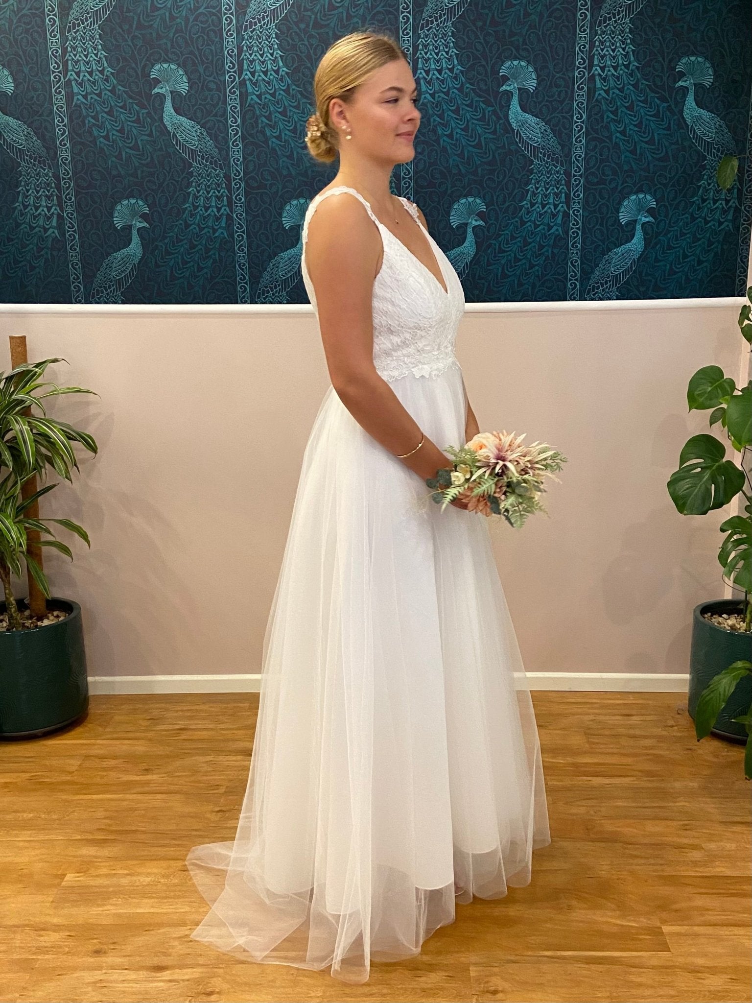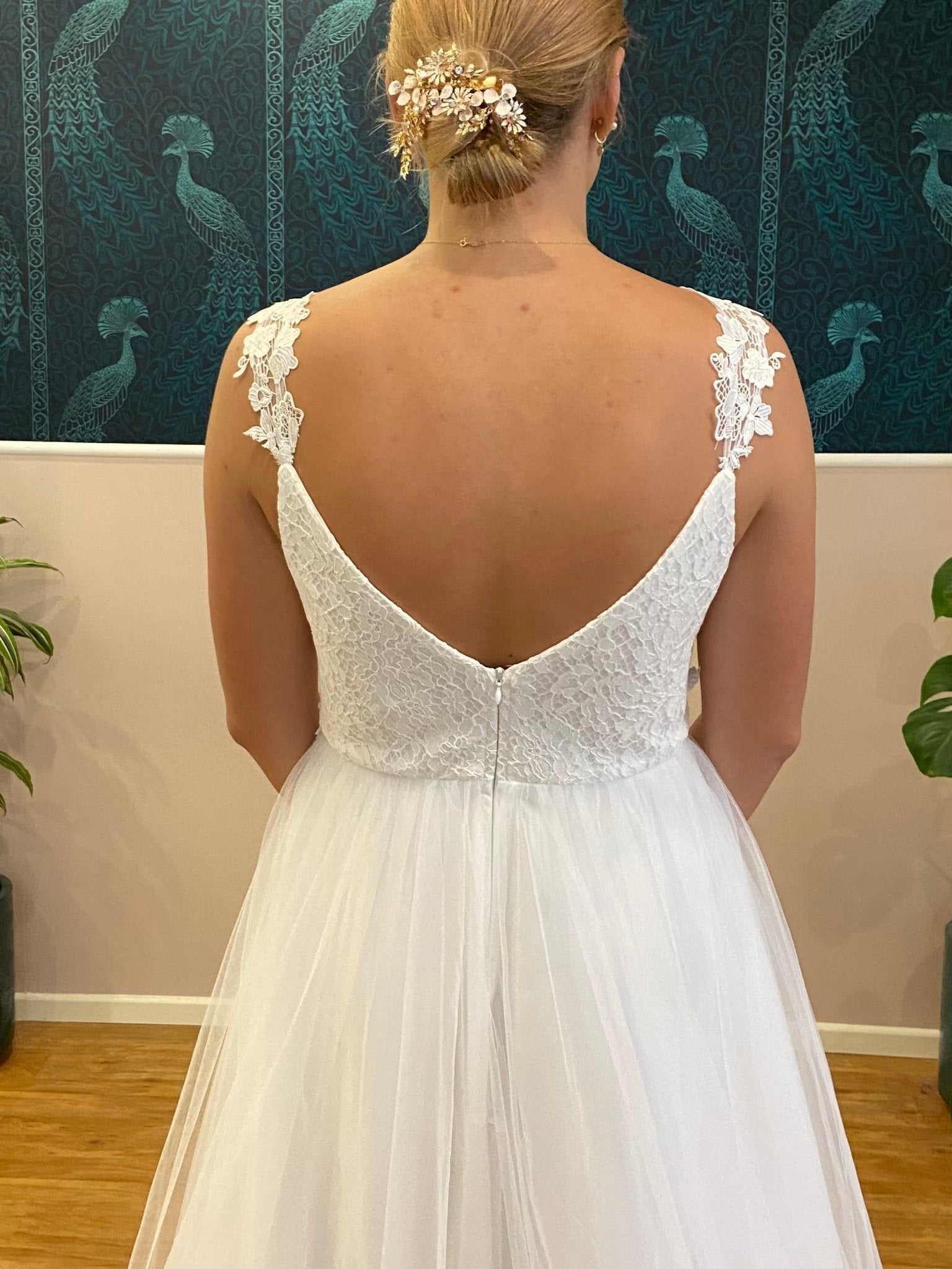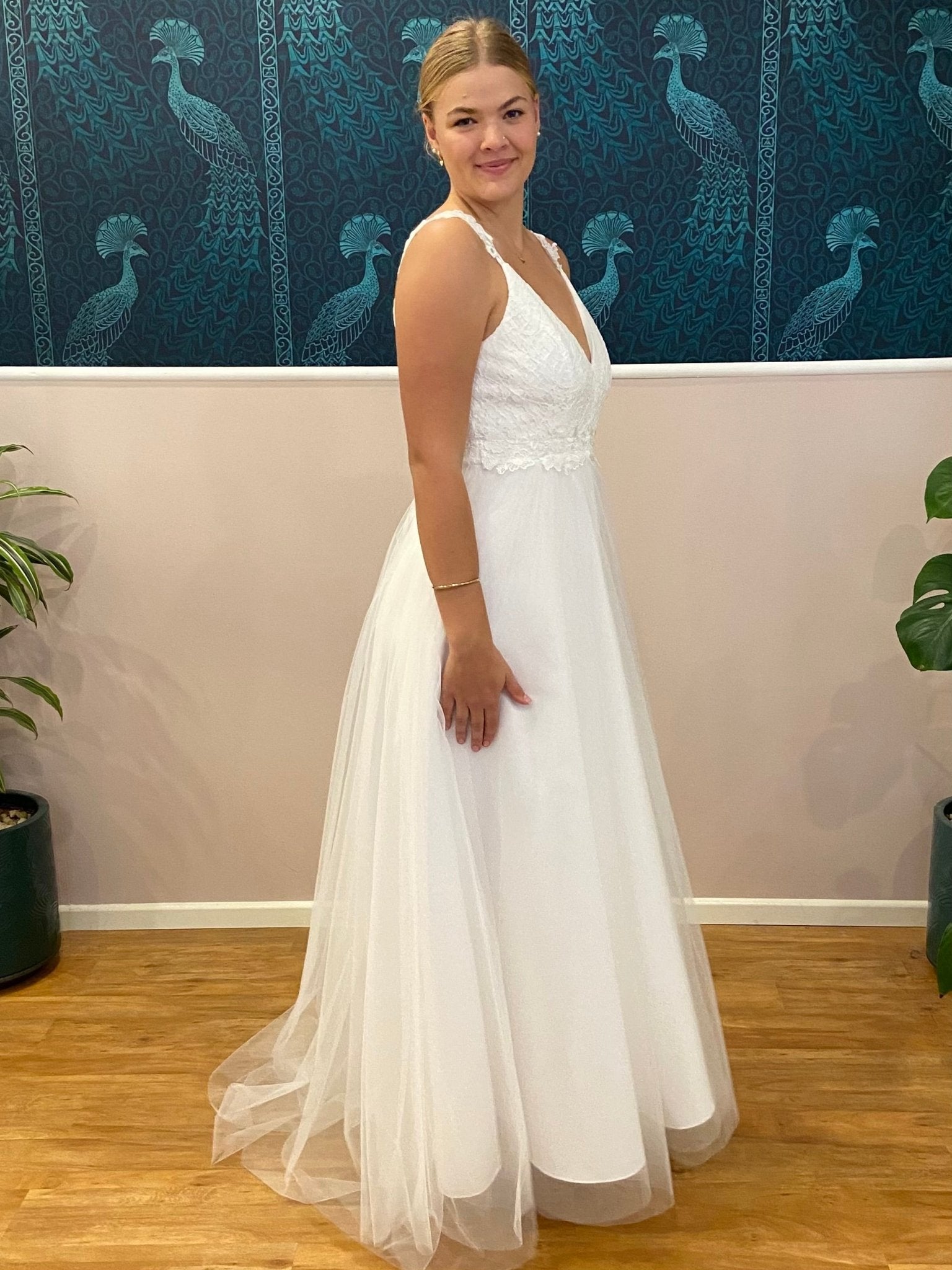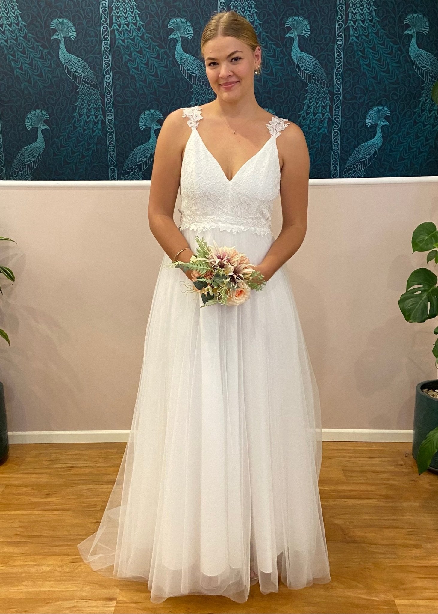 Introducing the Elizabeth Tulle Wedding Dress with a lace bodice and straps. Create your moment with the Elizabeth Double V-Neck Wedding Dress in elegant ivory — a stunning bridal gown crafted to combine timeless romance and modern silhouette. This gown can also be ordered under our 'buy to try' offer.