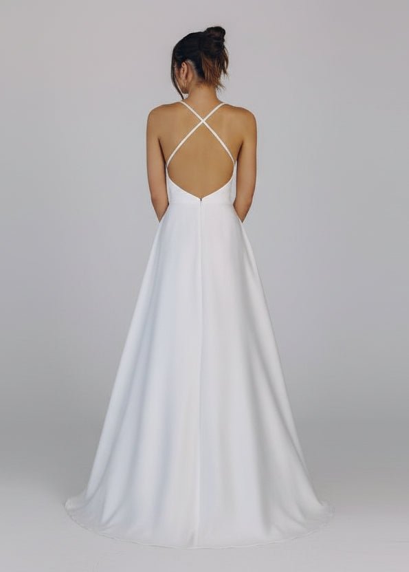Stunning satin cowl neck a-line wedding gown in ivory. A minimalist gown in soft satin with a gorgeous shine. This gown is young and has cross back straps with a low scoop back for great back exposure. A classic style that just doesn't go out of fashion. Loved also for not having a train so you can wear it all night long. Could also work as a reception dress if you have a more elaborate wedding gown for the ceremony.