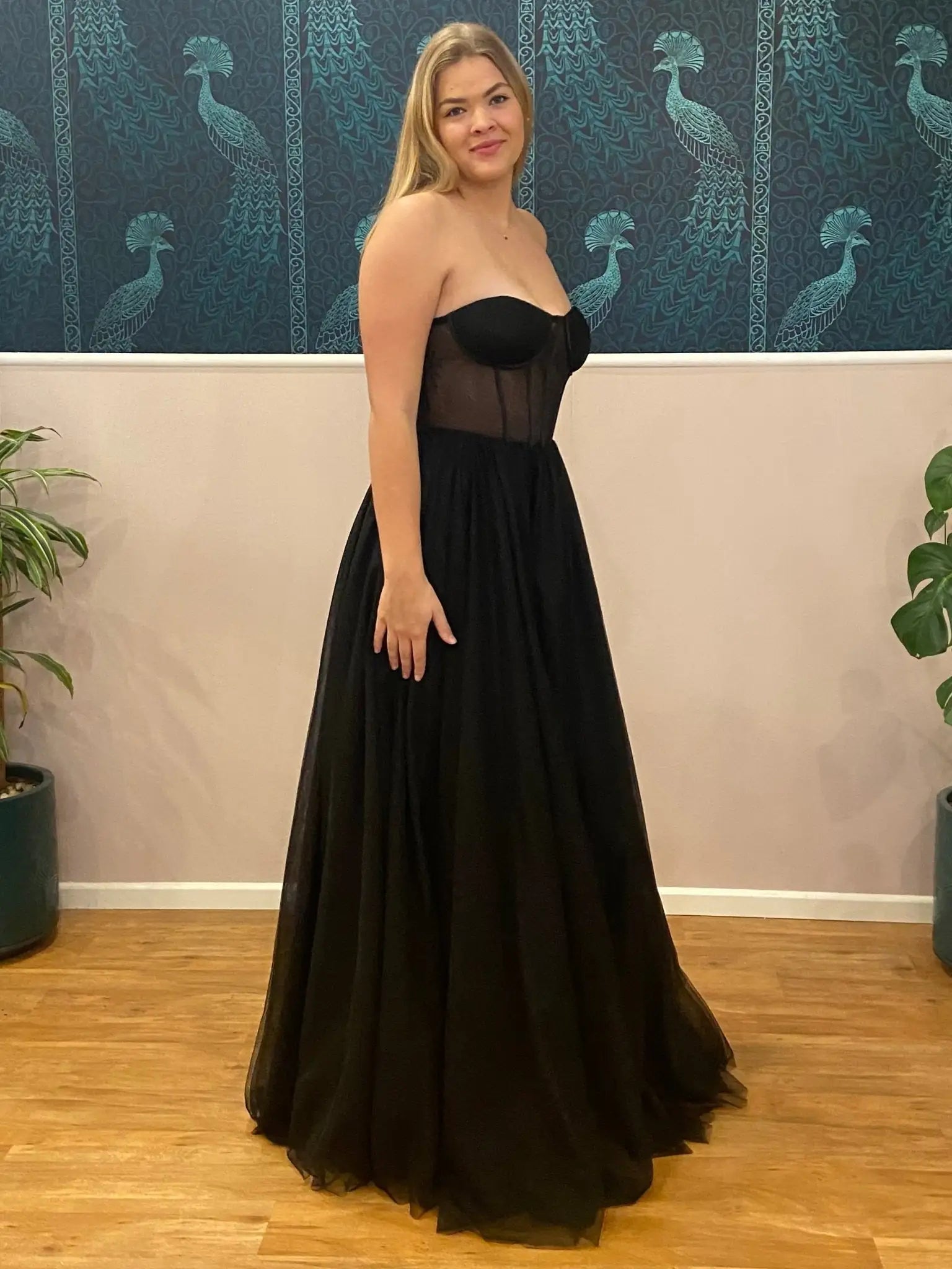 Meet our Jessy Black Corset Ball Dress with Lace Up Back. This sophisticated corset dress exemplifies versatile elegance with its adaptable design, offering the option to wear with or without straps. Meticulously crafted from premium tulle fabric, the full-length silhouette creates a dramatic, flowing effect while the structured corset bodice with lace-up detailing ensures a precise, flattering fit. Better suited to a smaller cup size Up to a B cup and great for taller girls.