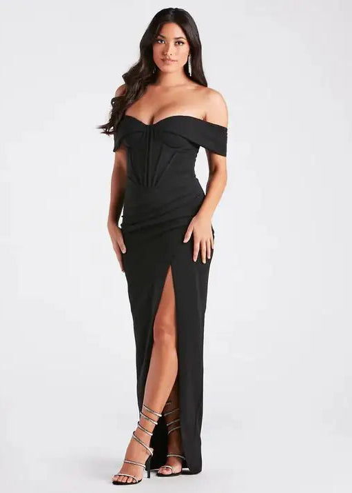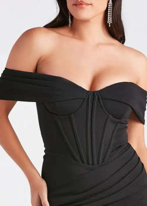 Attend your school ball in this Marlene Black Corset Cold Shoulder Ball Gown. This sophisticated dress features an alluring sweetheart neckline with short-sleeve cuffs and integrated padded bust for impeccable structure. The corset bodice, enhanced with boning, sculpts a captivating hourglass silhouette, while the high-waisted ruching adds dimensional texture. The sleek floor-length profile, crafted from a stretc knit fabric is lined and embraces your shape. Also a tasteful front slit perfect for distinguished social engagements.