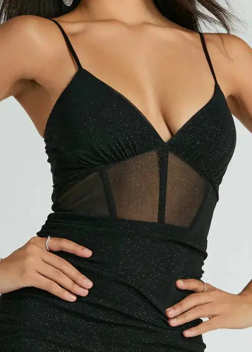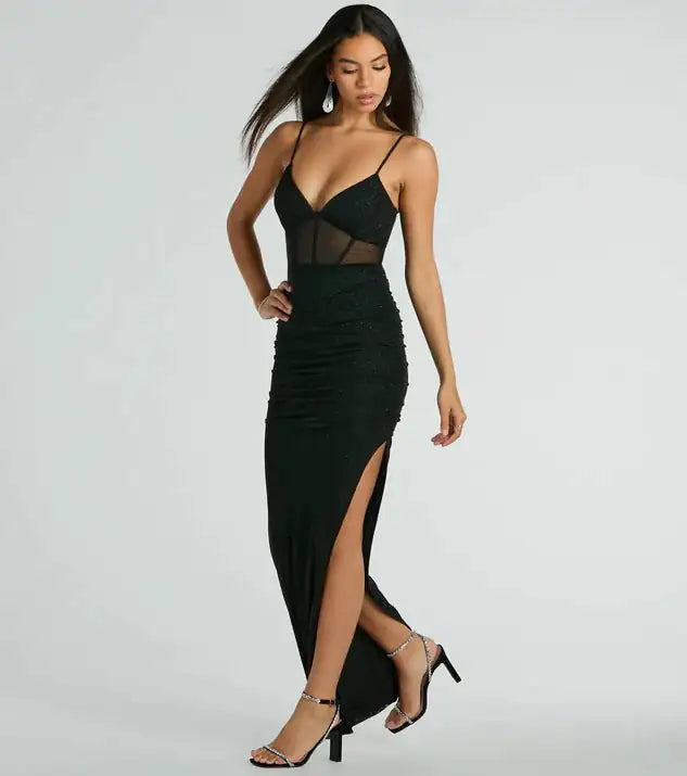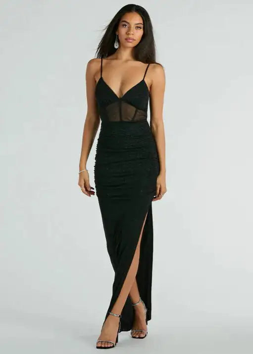 Enjoy your school ball in this Patsy Black Corset Ball Dress with Slit. Your ticket to becoming the belle of the ball! This show stopper features glittery mesh fabric that catches every light, making you twinkle with each step. The V-neckline and adjustable straps let you customize your perfect fit, while padded cups offer just-right support. The sheer corset bodice with flexible boning hugs your curves in all the right places, and that cheeky high side slit adds just enough drama to turn heads!