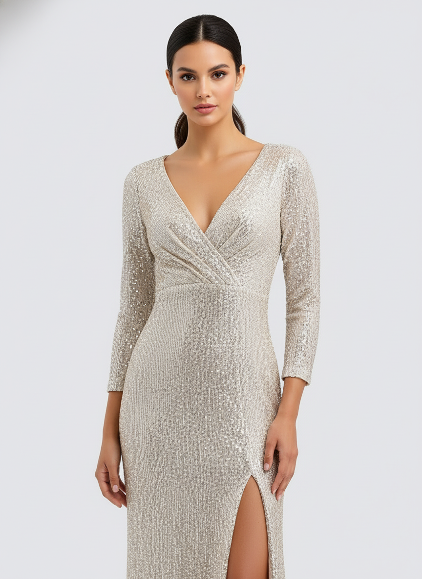 Gorgeous Evening Ball Dress with long sleeves, a dazzling gown designed to turn heads. Fully covered in shimmering sequins, this dress captures light beautifully for maximum sparkle. The elegant cross-over bodice flatters, while the long sleeves create an elegant look. A side split adds a hint of drama and movement, making every step feel graceful. Lined for comfort, the gown features a concealed back zip for a smooth, clean finish. Available in a range of rich colours including silver, burgundy, emerald, navy, and black, and offered in NZ sizes 8–24, the Elvira dress promises both glamorous style and inclusive sizing. With a length that varies between approximately 146–154 cm (depending on size), this dress is designed to complement a variety of body shapes and heights.