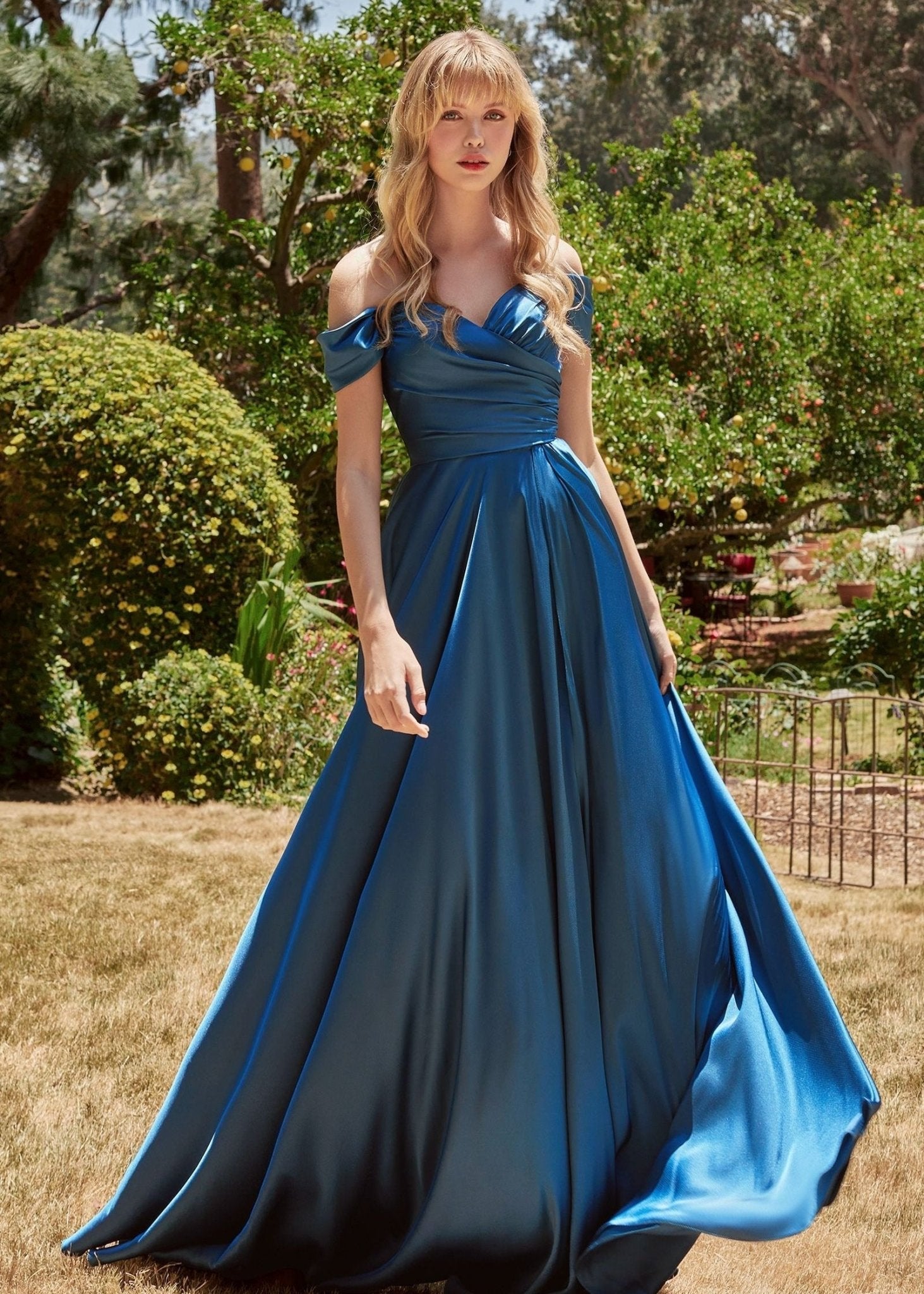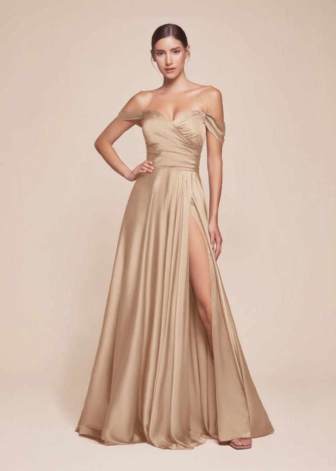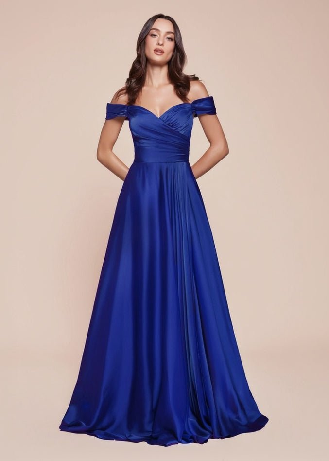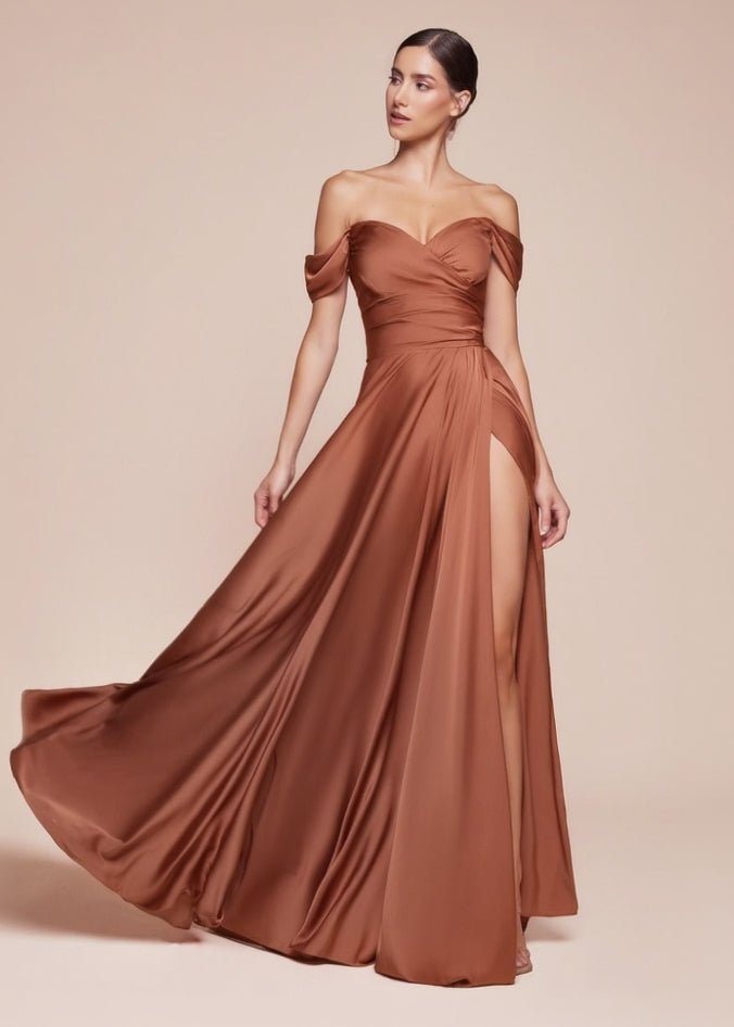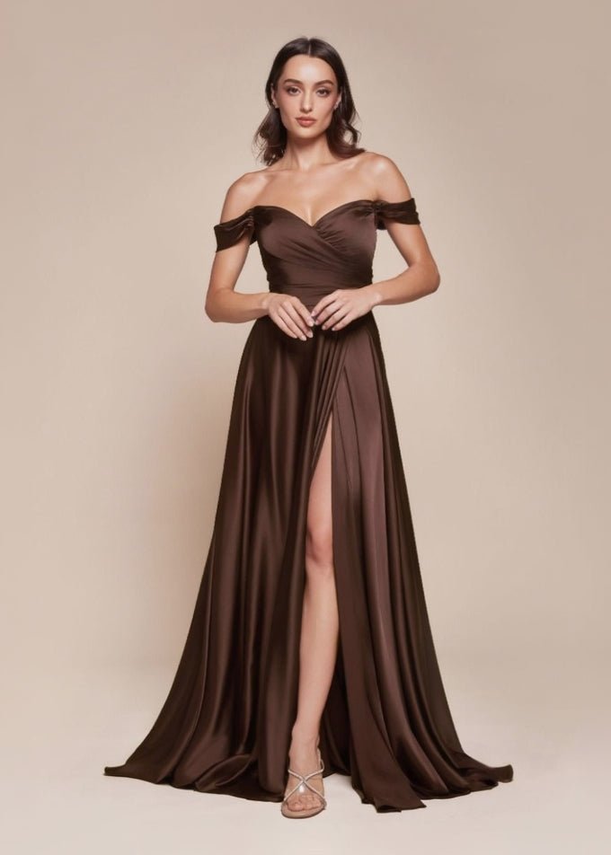Such a gorgeous Soft Satin bridesmaid or ballgown with drop sleeves. Embrace understated elegance with the Clarity bridesmaid or ballgown, a versatile satin dress designed for your most memorable moments. The flattering A-line silhouette pairs beautifully with a fitted bodice and sweetheart neckline, while off-the-shoulder sleeves add romantic flair. Crafted from luxuriously soft satin, this gown features a gathered waistline and subtle side slit for effortless movement. Perfect for bridesmaids, wedding guests, or any formal occasion where timeless sophistication matters.
