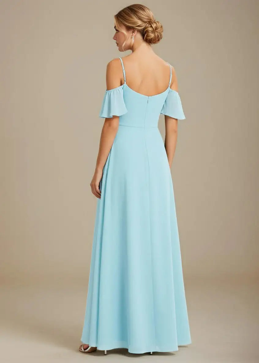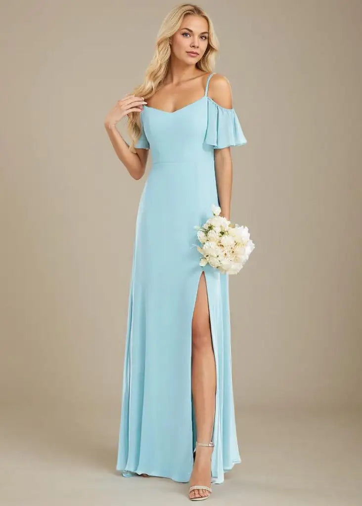 Glamorous drop shoulder ball dress with thin adjustable straps. This dress is lined and does up at the back with a concealed zip. It features a front-side split, thin straps and drop flutter sleeves. Such a gorgeous look and favoured by many.