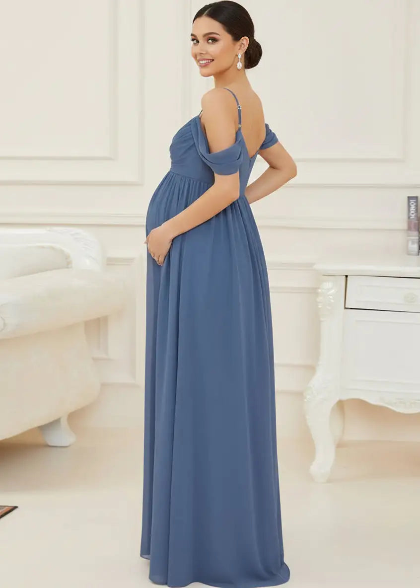 Beautiful chiffon maternity dress. Perfect for your special day. This dress has thin straps and draping sleeves. It has gathering under the bust for a comfortable fit. This dress is lined and does up with a back zip.