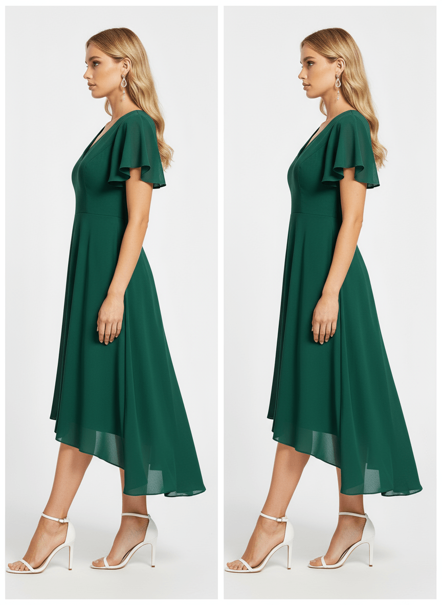 A great dress for the mother of the bride/groom, a wedding guest a day dress or a short summer bridesmaid dress. Beautiful soft chiffon gown with a high low style and overlay of fabric at the front.  This gown has lovely flutter sleeves for coverage and a V-neck front and back.  It is fully lined and does up with a back zip.