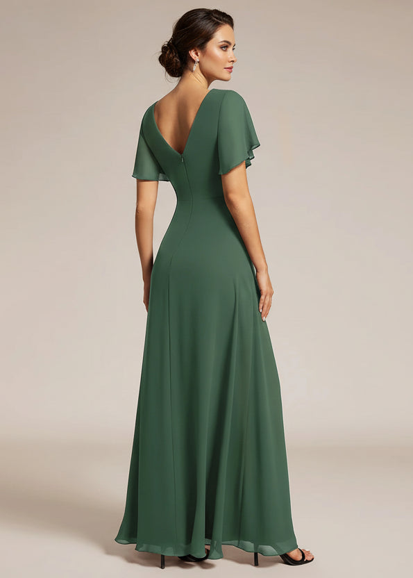 Get ready to turn heads in Bernice V-Neck chiffon bridesmaid dress, This A-line stunner features a daring high slit and playful ruffle sleeves, perfect for a chic wedding ceremony. The pleated details and high waist add a touch of elegance to make you stand out as a bridesmaid and give a little extra coverage. This gown does up with a concealed zip and is lined.