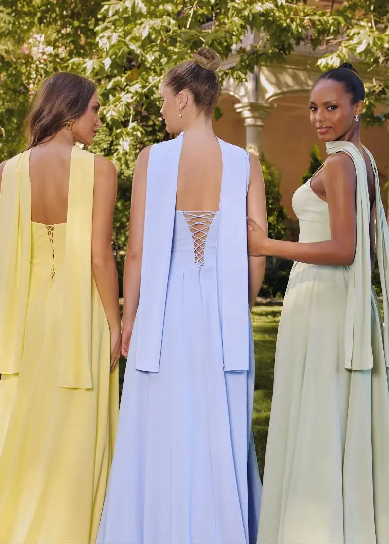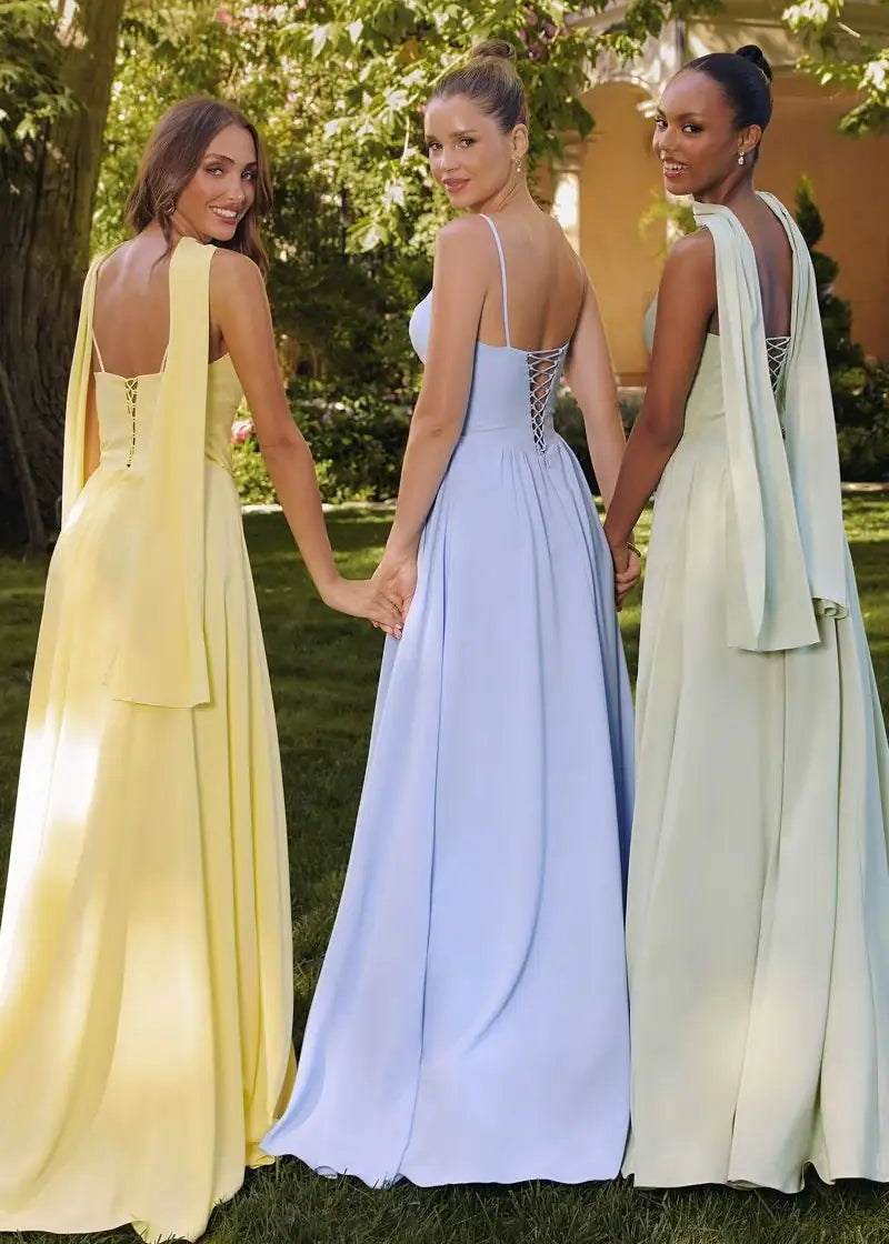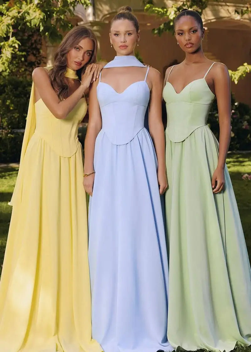 These Paige Pastel Corset Bridesmaid or Ball Gowns in Chiffon are delicate and romantic, this A-line gown features a structured bodice with flattering princess seams and a modern pointed sweetheart neckline. Spaghetti straps provide a minimalist touch, while a lace-up back ensures a customizable fit. A soft chiffon skirt flows beautifully with every step, making this dress a graceful option for weddings, formal events, or spring garden parties.