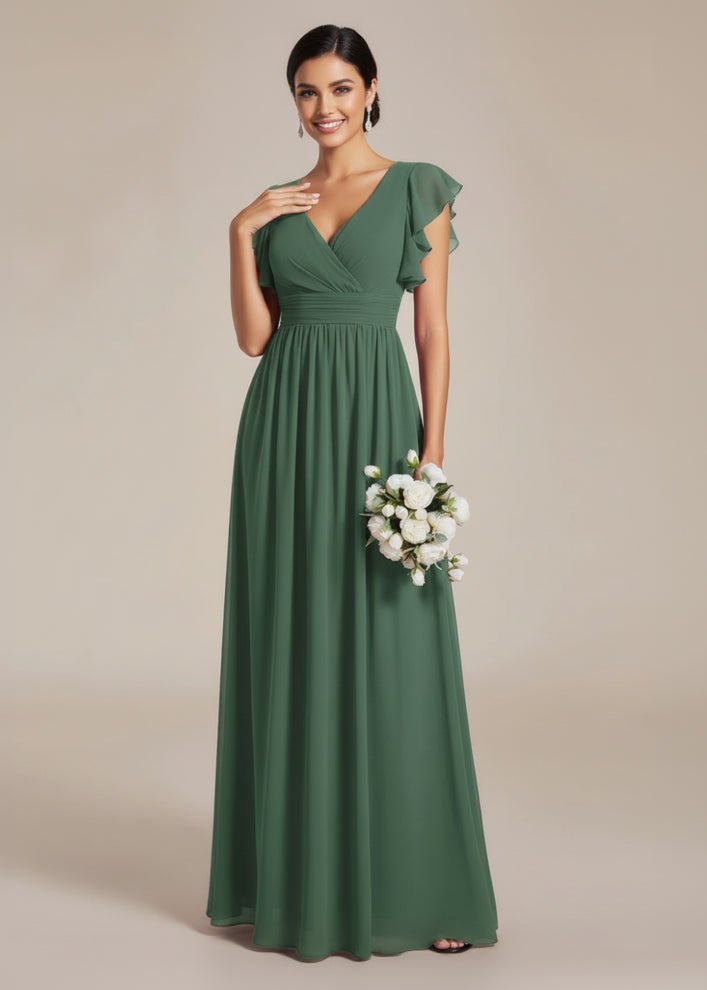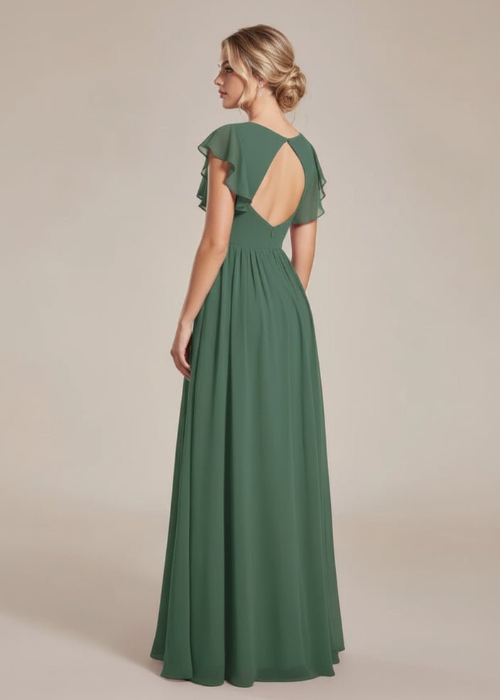 The Terry Chiffon Bridesmaid dress will mix and match with our other chiffong gowns. I great addition to your bridal party. With lots of gathering over the waist for comfortable movement and coverage. Cute little flutter sleeves and open open back for a young look. The V neck flatters all shapes and sizes.