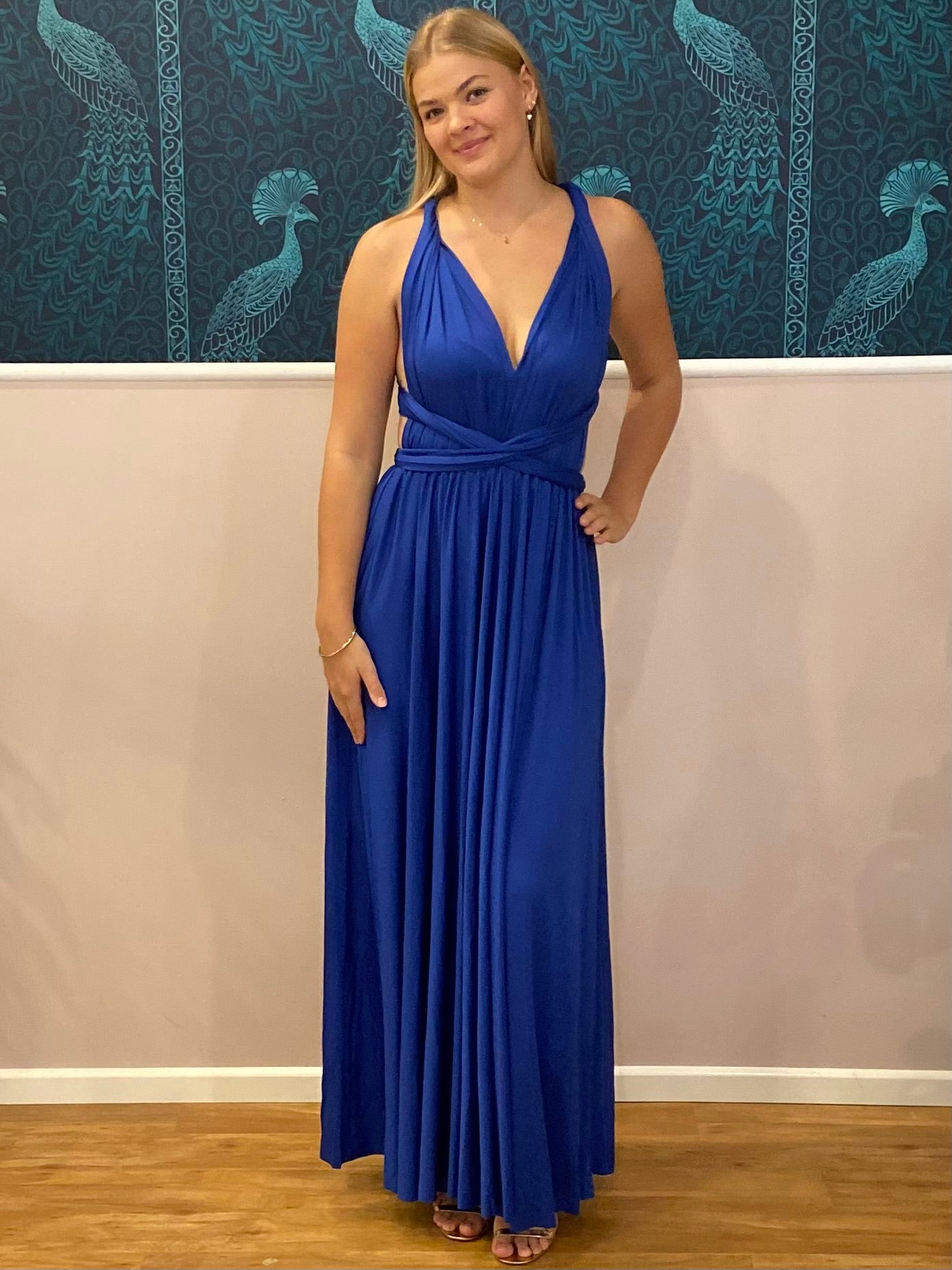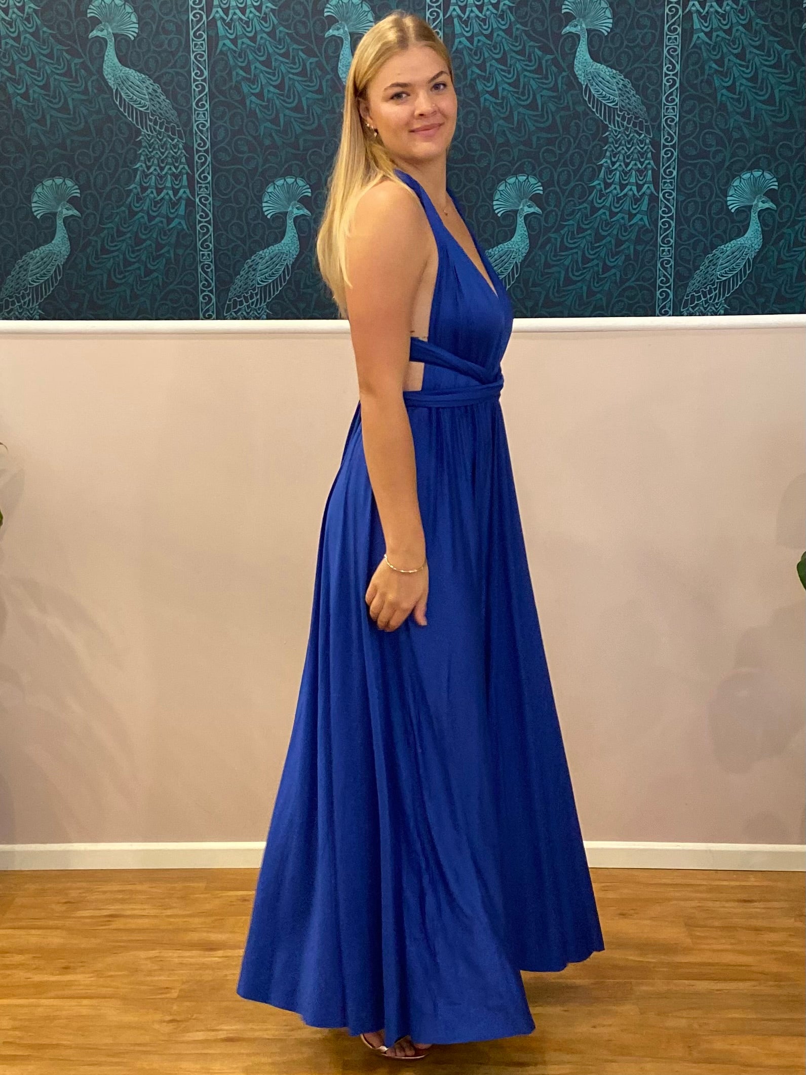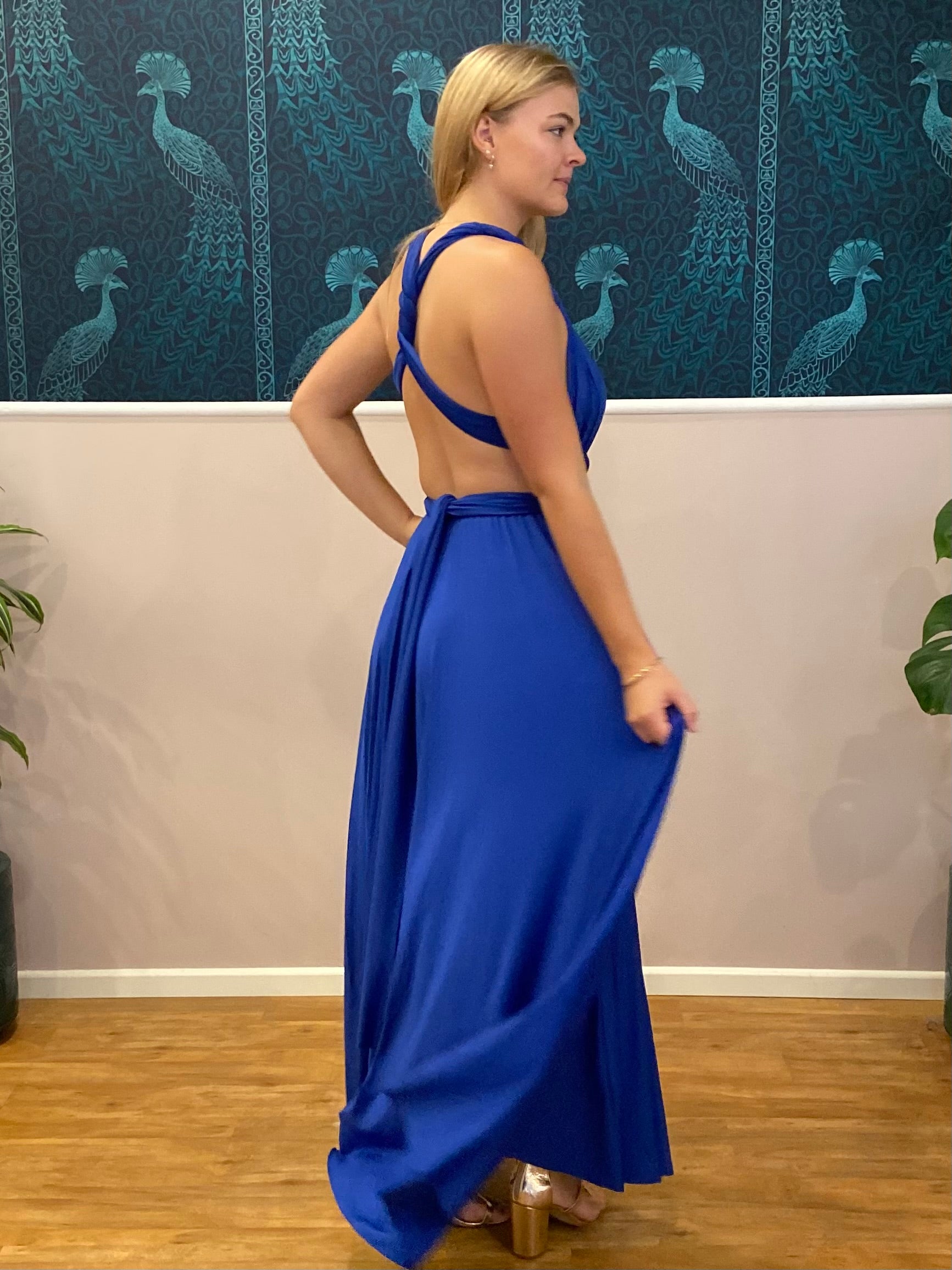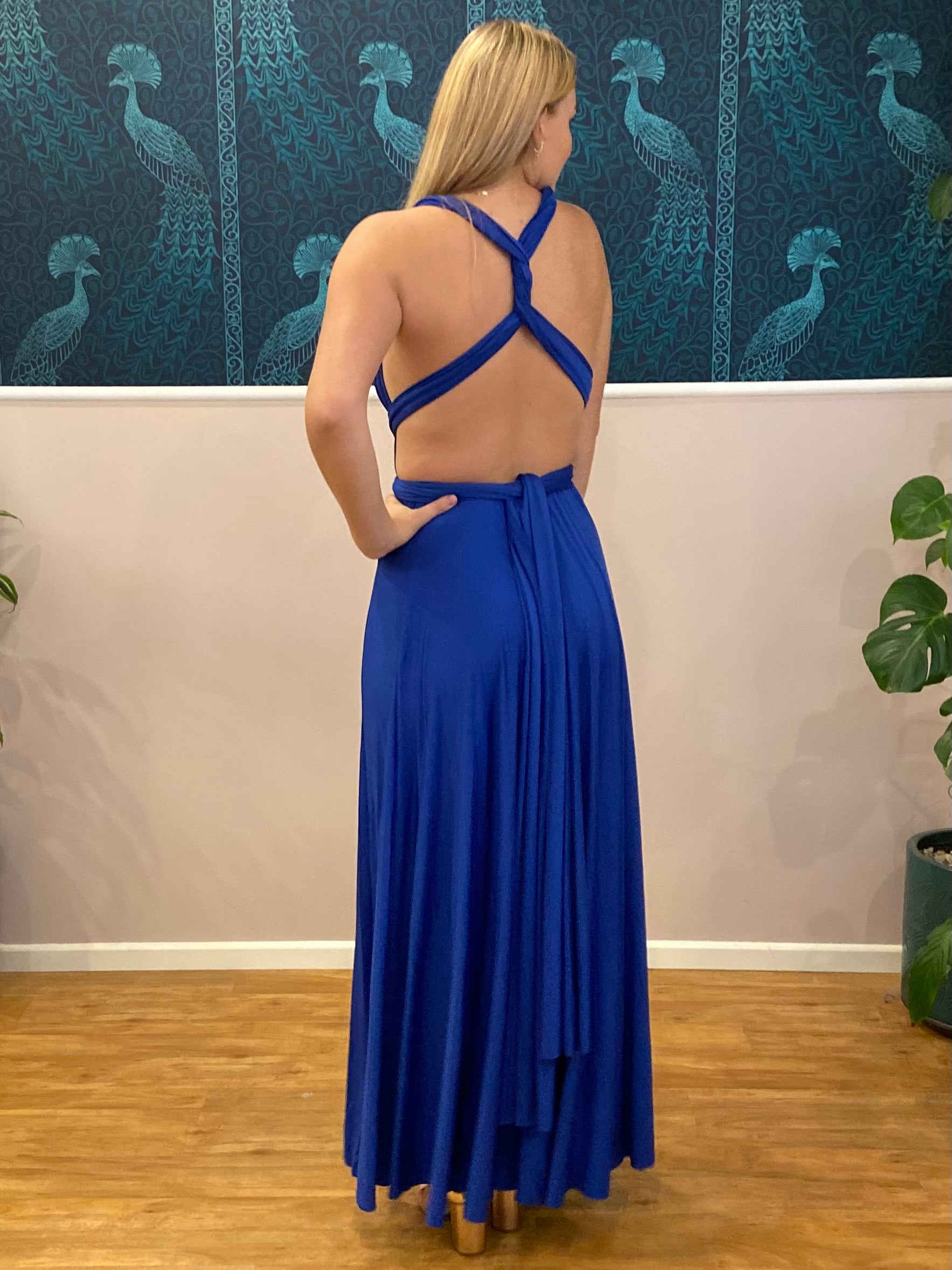 This is our Infinity Multiway dress in Royal Blue. So many ways to wear with wrap around convertible straps, with a flexible waistline and a full skirt that flatters all shapes and sizes. Such a classic and timeless gown with endless possibilities. Attend special events, bridal parties and maternity shoots in this stunning elegant infinity gown.