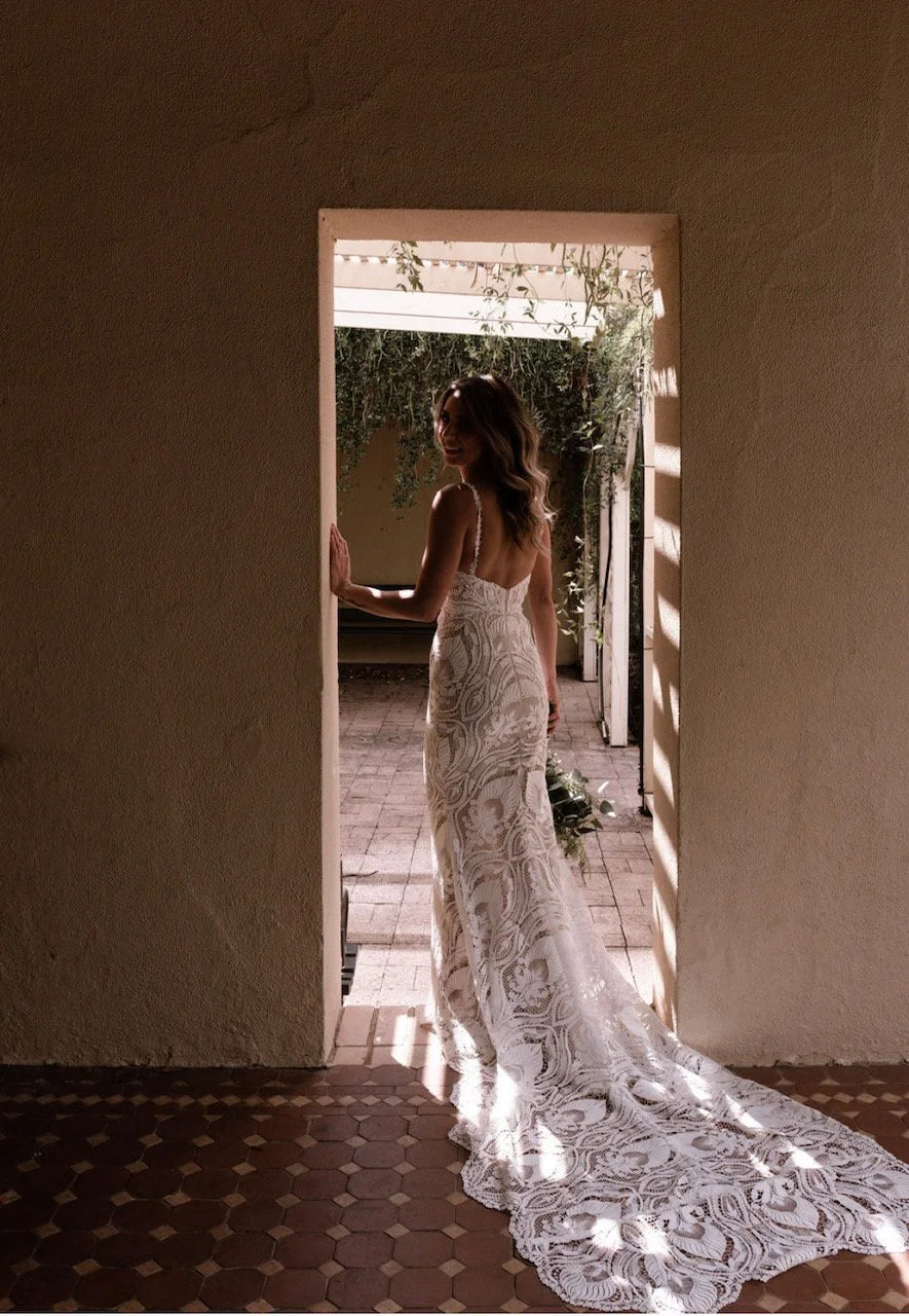 Part of the Outback Romance collection, this gown features a straight silhouette and a sweetheart neckline crafted from timeless boho lace in an ivory champagne shade. It includes delicate straps, a V-back design, and a detachable overskirt made of lace and tulle, offering both elegance and versatility.