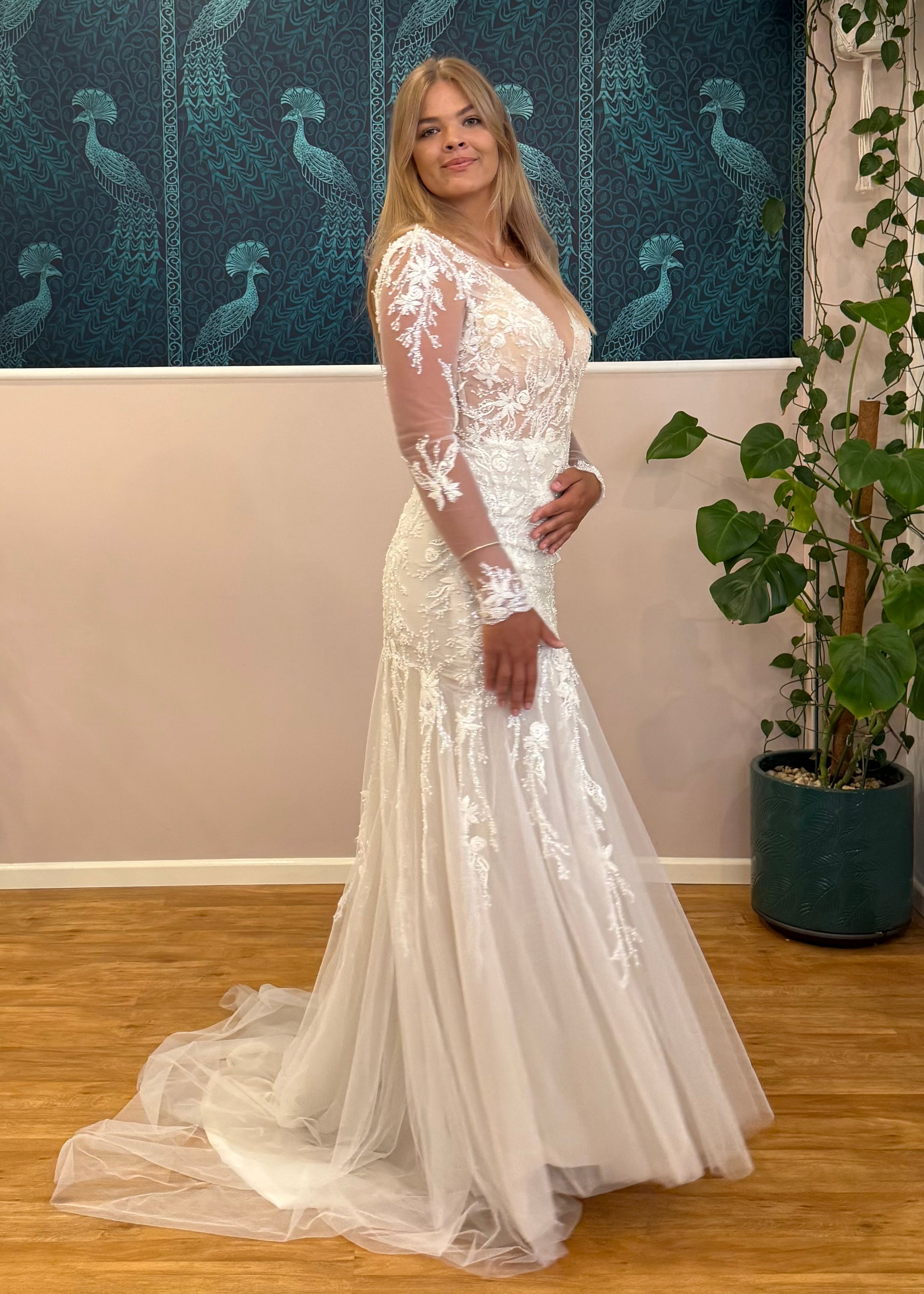 This beaded mermaid gown from the Evergreen collection features a fit and flare silhouette that elegantly enhances your figure. Crafted from delicate tulle and lace, it showcases a flattering V-neckline and a graceful scoop back. The long sleeves add a timeless touch, while intricate beading throughout the dress brings subtle sparkle. Presented in a sophisticated ivory, champagne, and nude palette, this gown combines classic design with refined detail for a truly memorable bridal look.