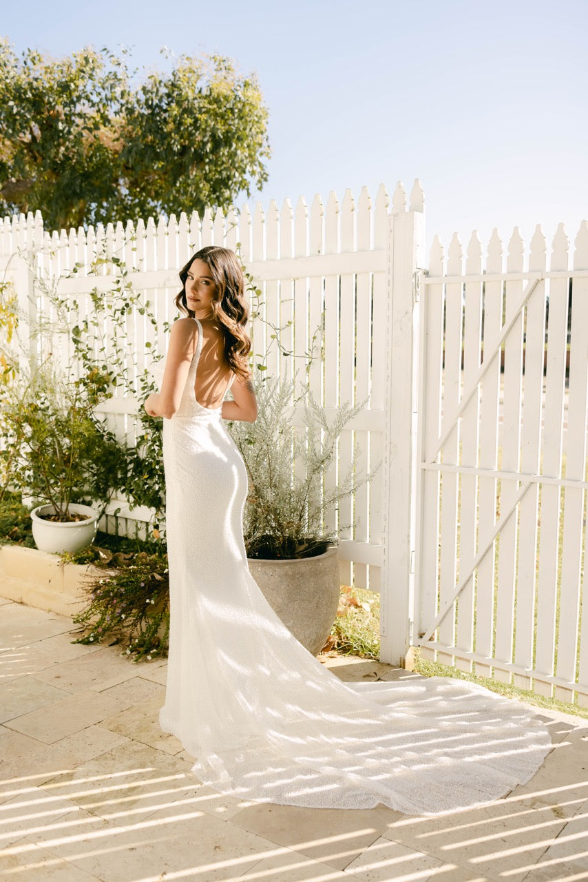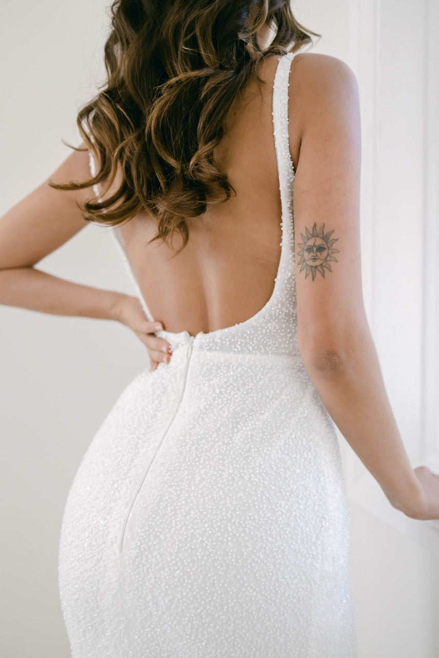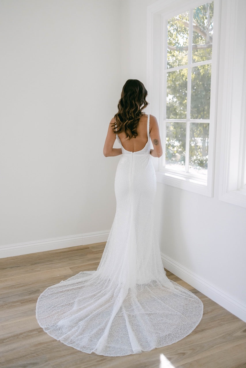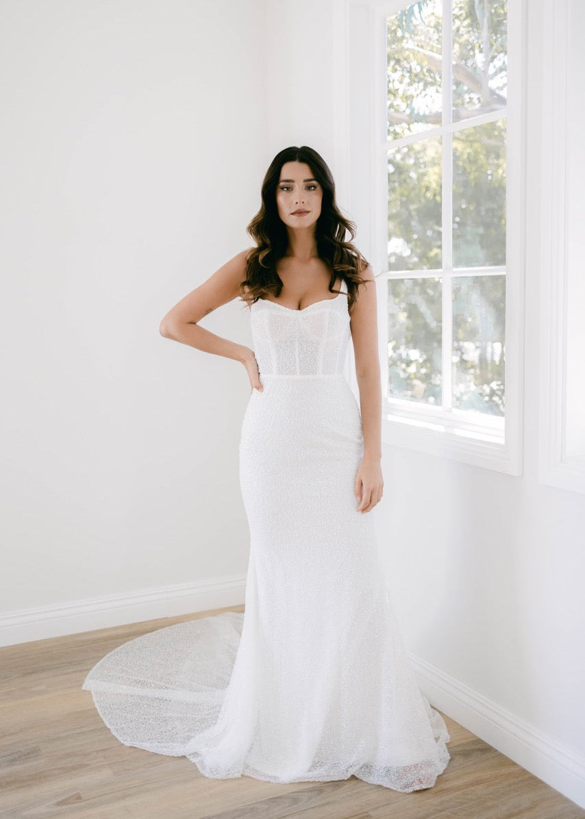MILA | The beaded gown of your dreams. Mila is a stunning fully beaded ivory gown, featuring a structured boned bodice, low back, and fitted mermaid skirt. Make a grand entrance and capture the moment in Mila - and say yes to your dream dress. With exquisite details and a luxurious silhouette, you'll be ready to make a lasting impression.