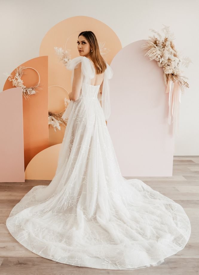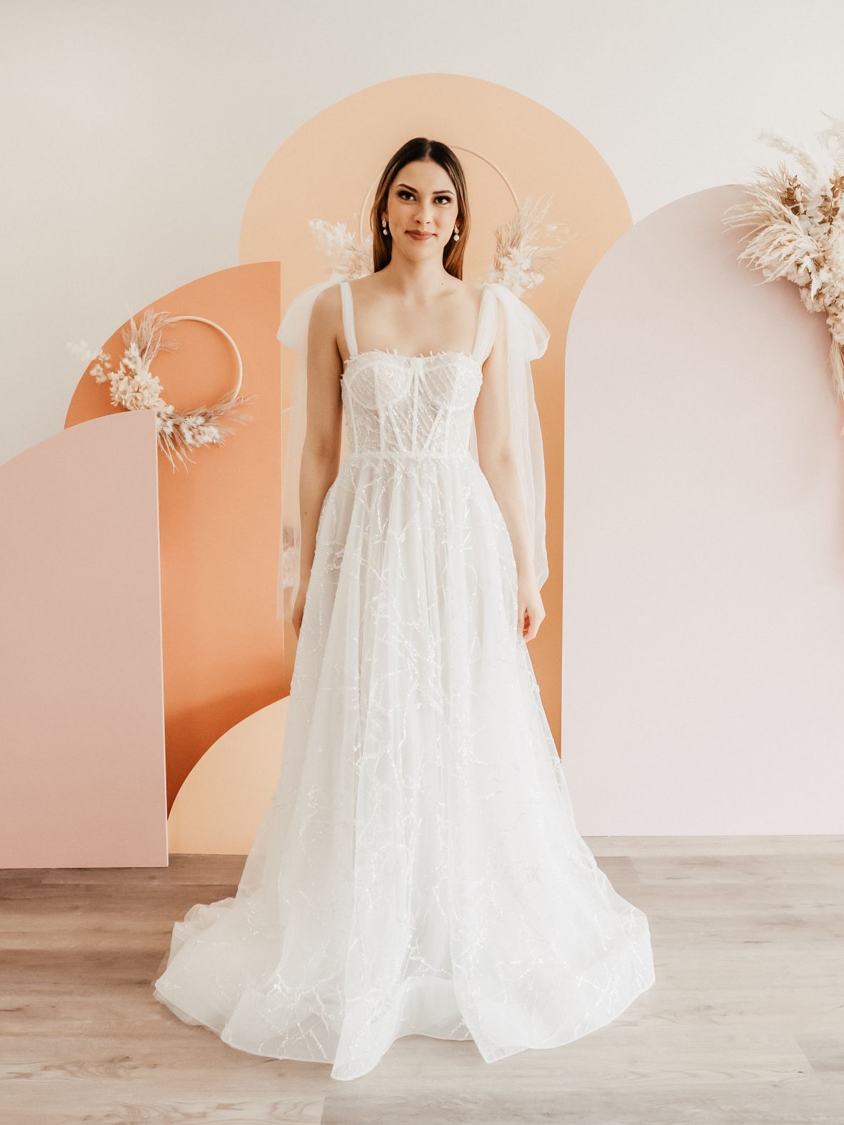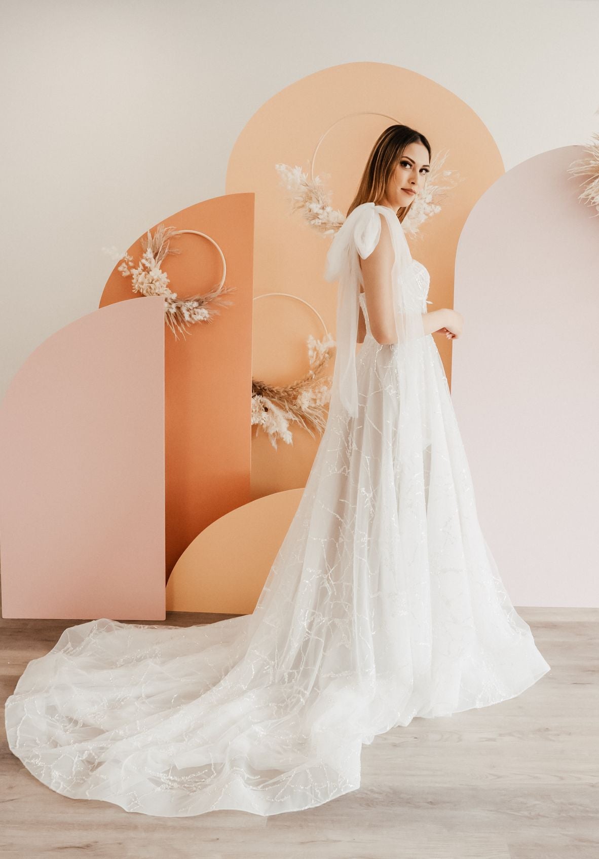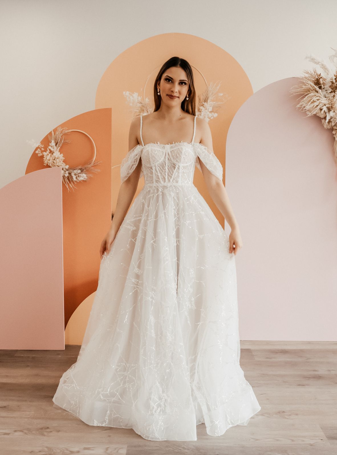 From the Aurous collection, this elegant A-line wedding dress features a straight neckline and is crafted from beaded lace and delicate tulle. The off-shoulder design is complemented by customisable tulle straps, with three detachable strap options for versatile styling. The gown is detailed with shimmering lace that adds a refined, timeless allure.