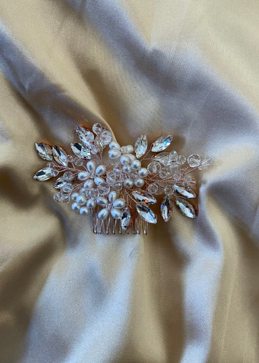 This sophisticated hair comb showcases a rose gold floral arrangement adorned with sparkling diamantes, pearls and clear faceted beads, elevating any hairstyle with subtle elegance. Designed for a secure fit, it remains firmly in place throughout the day.