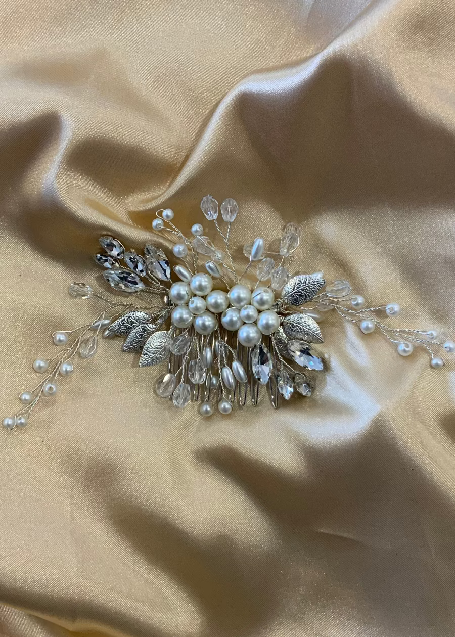 This elegant hair comb showcases a floral design crafted from pearls, silver leaves, sparkling diamantes, and translucent beads.