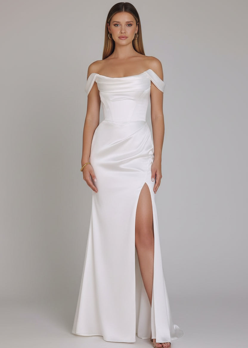 Structured bodice for a flattering fit with hidden zipper back closureIntroducting the Cindy Ivory Satin Wedding Dress with Slit. Make a confident statement in this stunning satin gown. The softly draped neckline and sculpted bodice define your waist with modern elegance, while the smooth satin fabrication hugs your figure effortlessly. A dramatic leg slit adds movement and style, giving you that show-stopping moment. Removable straps offer versatile styling—wear it strapless for pure sophistication or add support when you need it. Perfect for weddings, engagement ceremonies or elopements.