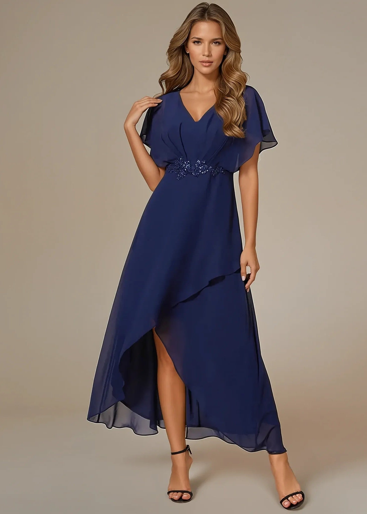 Such a beautiful navy chiffon gown with a high low style and midi length.  Perfect for any special occasion.  The waist is decorated with non-contrasting black beading with appliquéing and the top is cape like for comfort and great style.  This will be a favourite in your wardrobe.