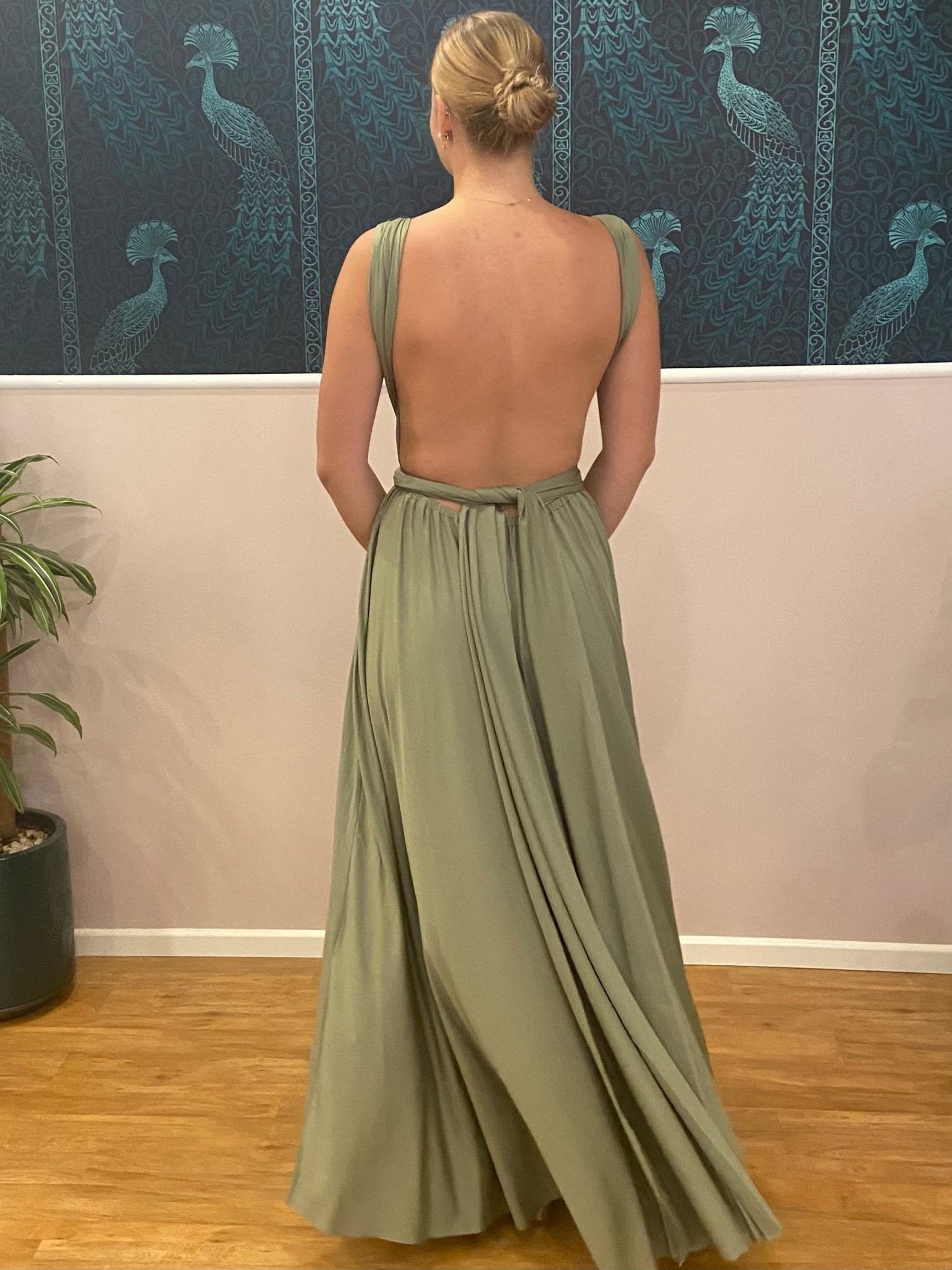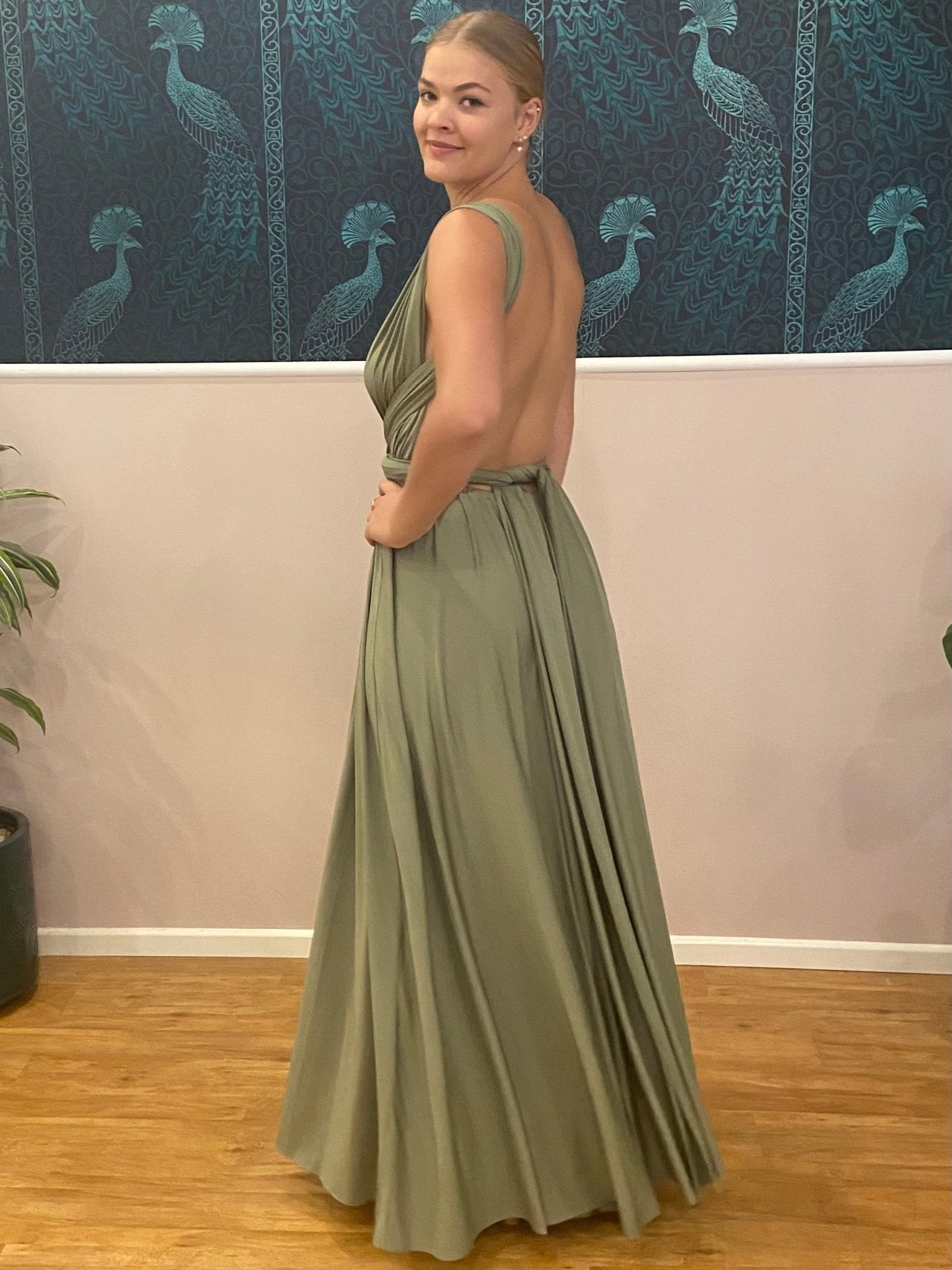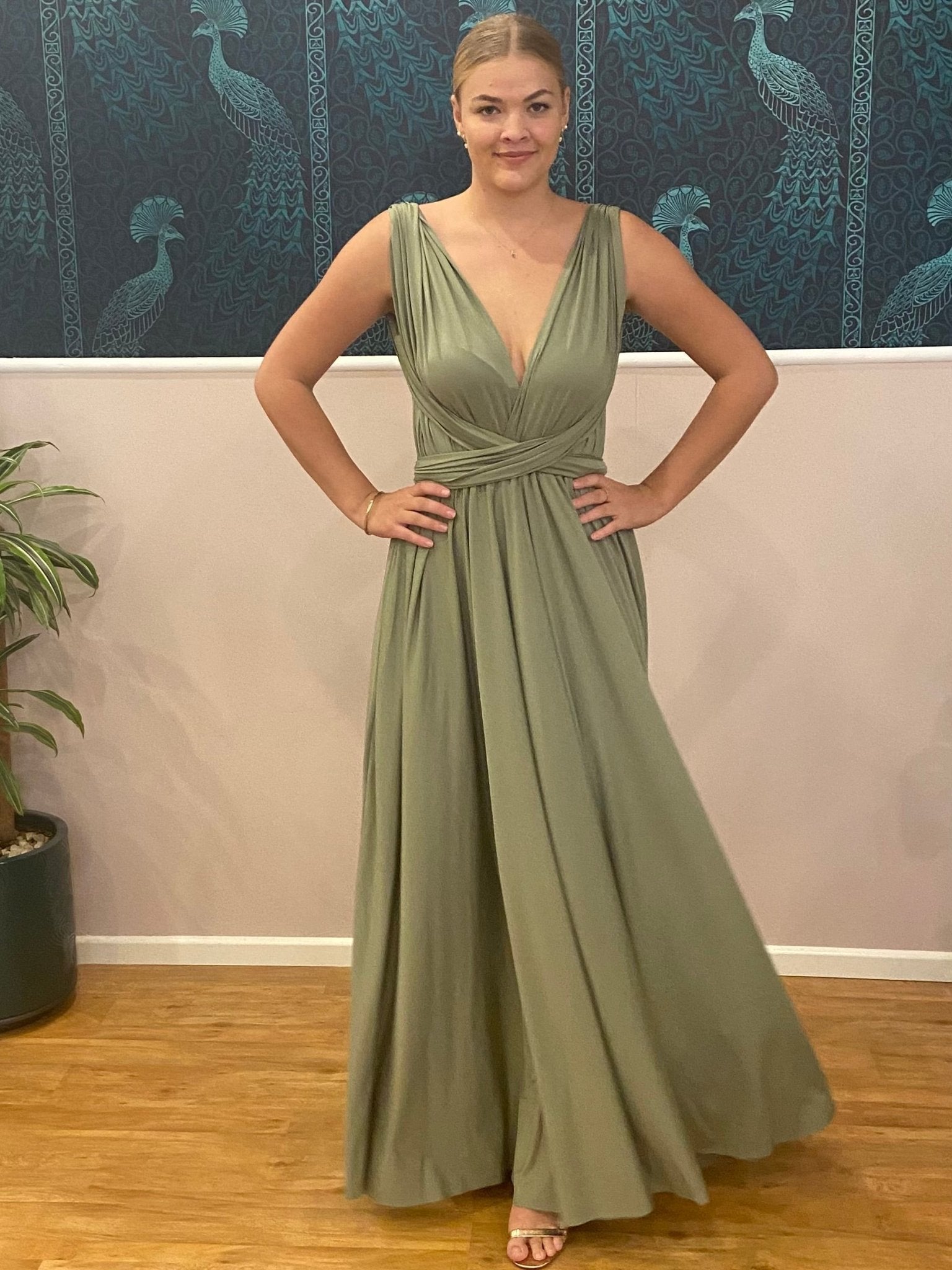 This is our NZ Stocked Infinity Bridesmaid Dress | Convertible Multiway Maxi Dress in Olive. So many ways to wear with wrap around convertible straps. The stretch waistline is flexible and a full skirt that flatters all shapes and sizes. Such a classic and timeless gown with endless possibilities. Attend special events, bridal parties and maternity shoots in this stunning elegant infinity gown.