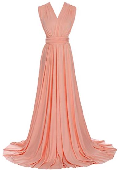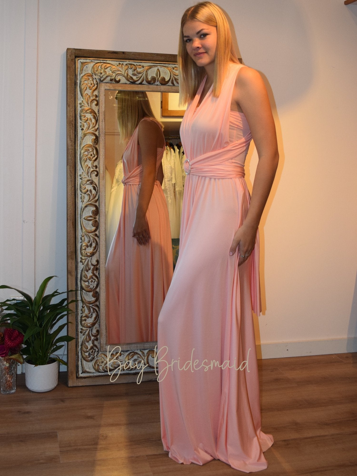 This is our Infinity Multiway dress in Peach Pink. So many ways to wear with wrap around convertible straps, with a flexible waistline and a full skirt that flatters all shapes and sizes. Such a classic and timeless gown with endless possibilities. Attend special events, bridal parties and maternity shoots in this stunning elegant infinity gown.