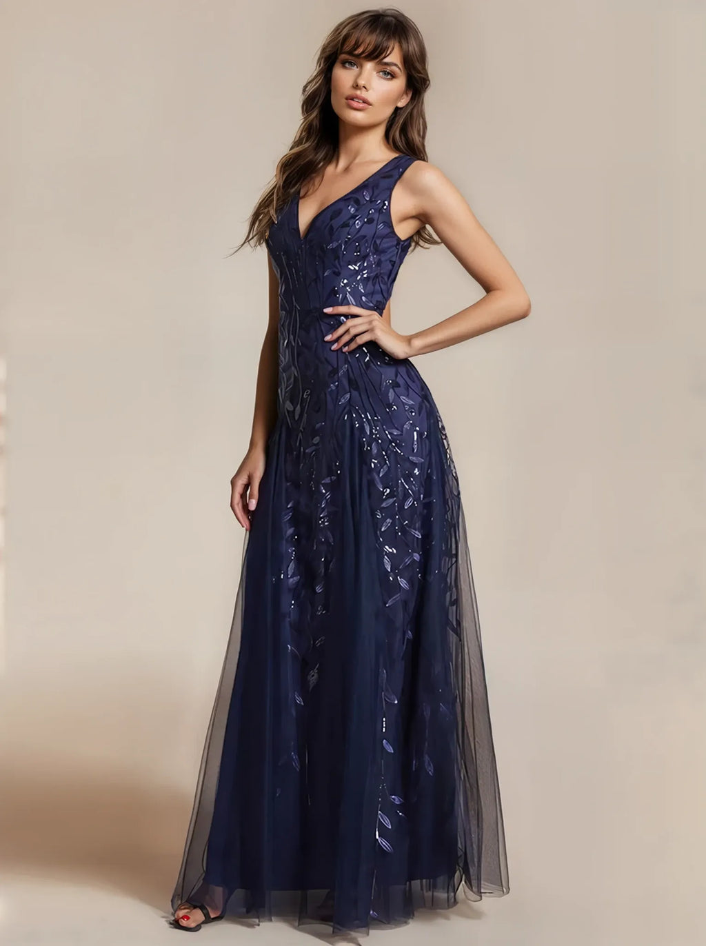 Krystal leaf pattern dress with sequins in dusky navy Express NZ wide - Bay Bridal and Ball Gowns