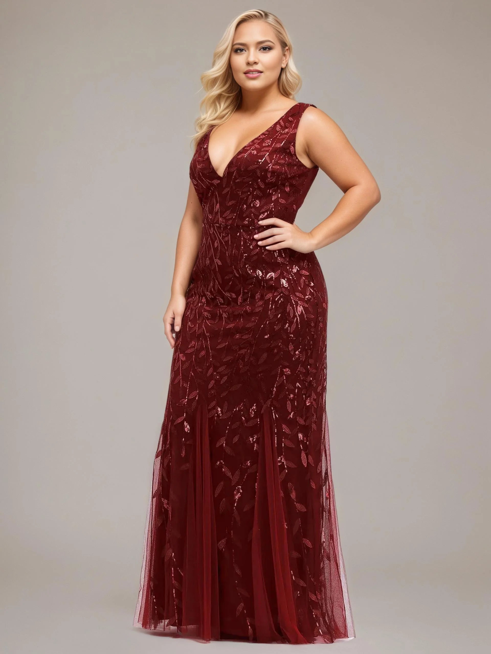 Most elegant fitted ball, bridesmaid or mother of the bride dress. The gown is sleeveless and has a beautiful cut at the bodice and flares out at the base. The fabric is stunning in an embroidered sequin leaf patterned design. It does up with a concealed back zip at the back and is lined. Another showstopper gown from this collection.