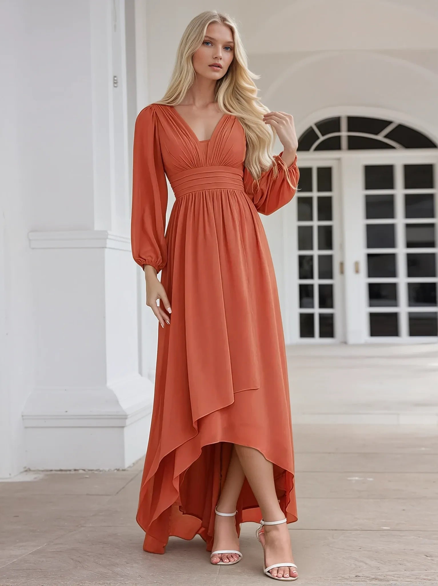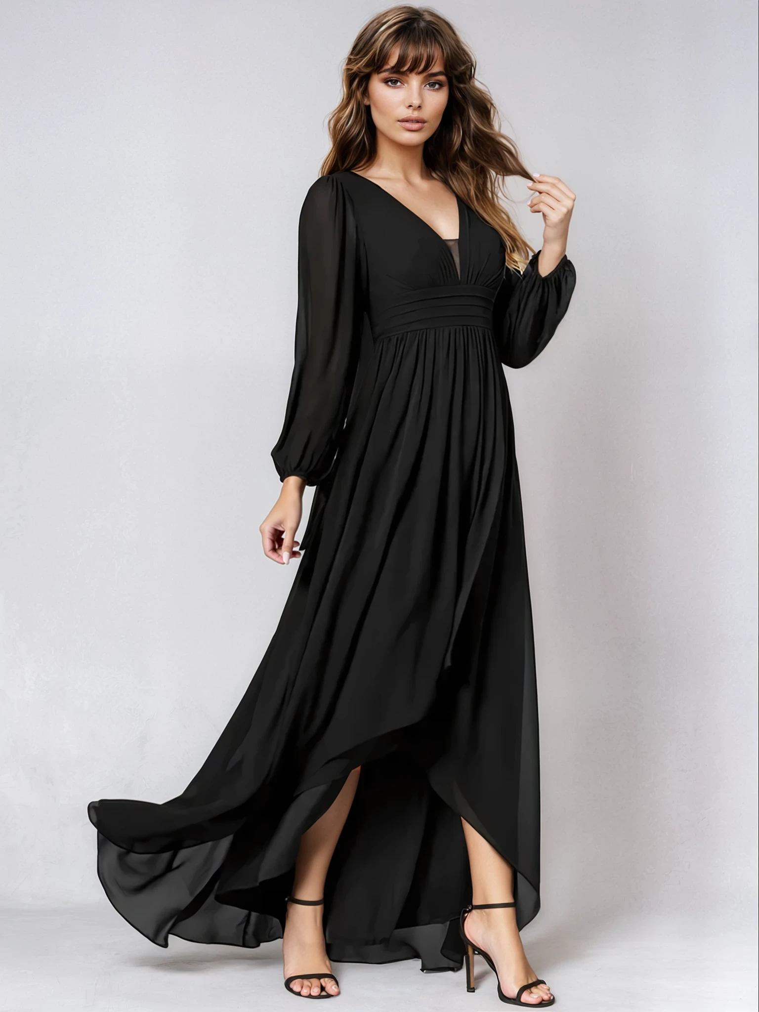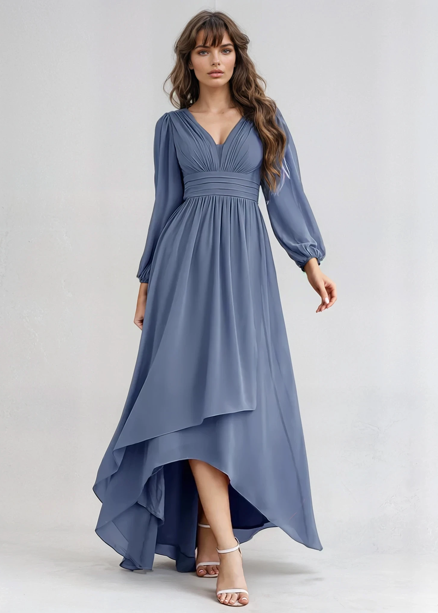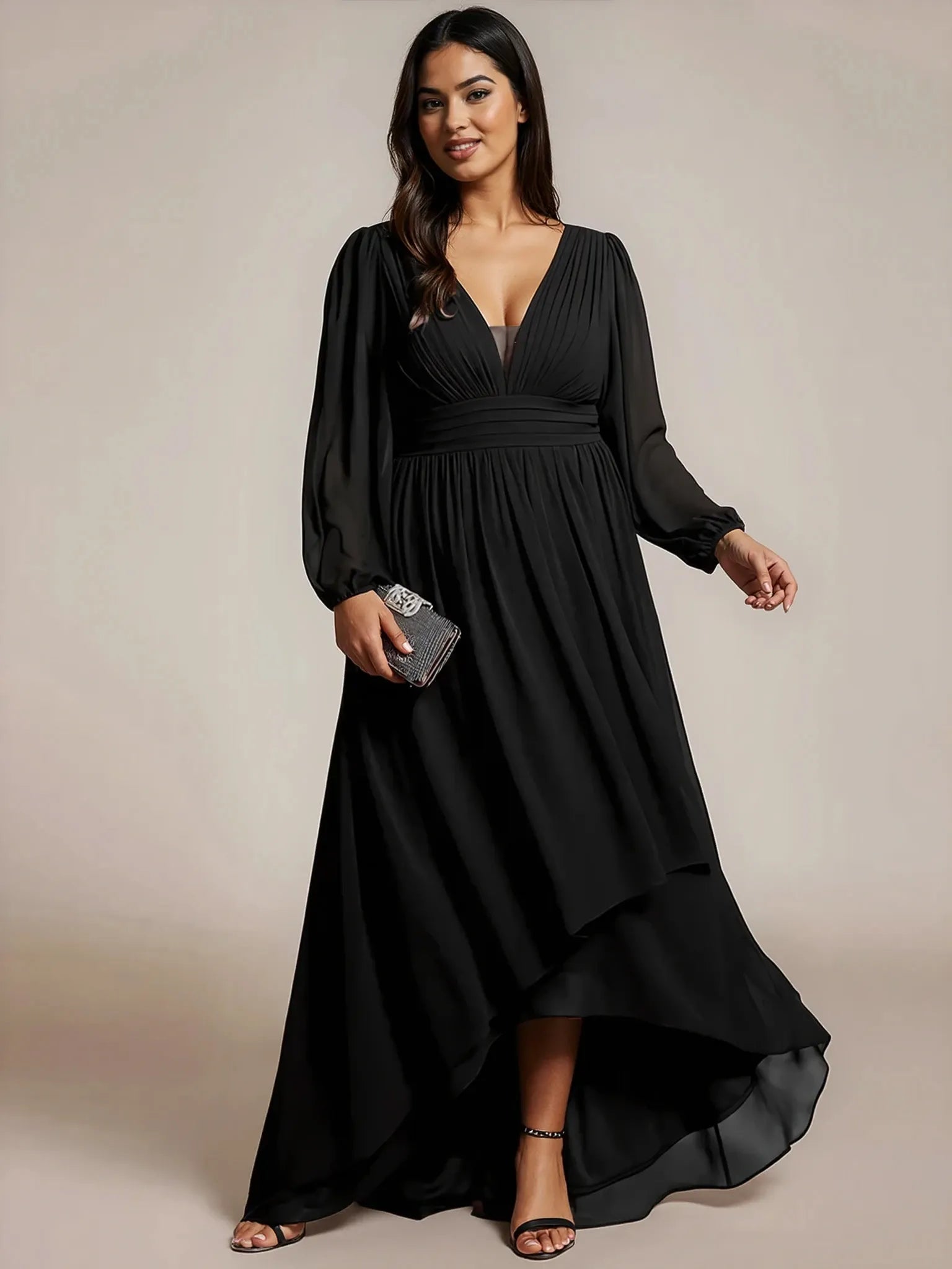 Belindy a-line lantern sleeve midi hi low dress. Meticulously crafted, the cascading chiffon fabric creates allow for extra coverage under the waist if required. Perfect for any event whether it be for a mother of the bride or groom, maid of honour, bridesmaid or for an evening out. This gown does up with a back zip, is lined and had bust padding. With the full cover back, you can wear a bra with this gown.