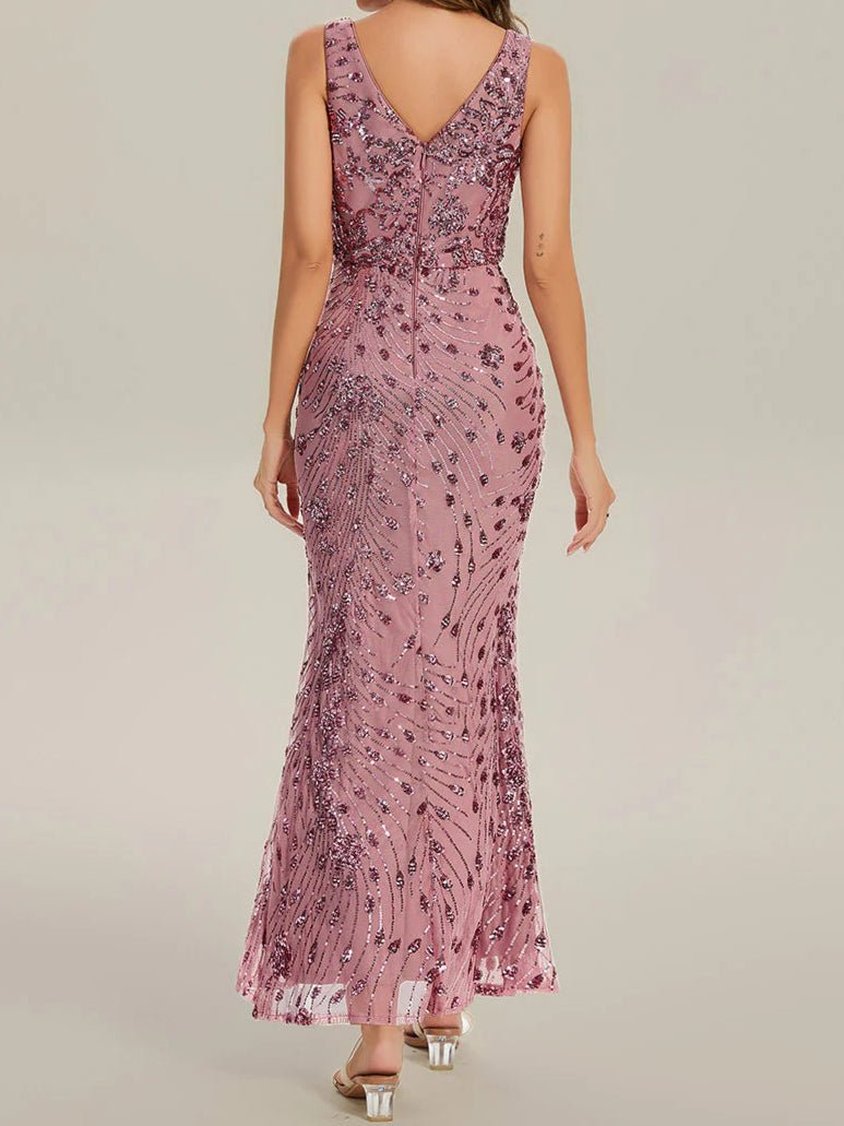 The Gabriel Midi Sequin Mother of the Bride/Groom Dress is designed to make your special day even more memorable. Adorned with delicate floral sequins that catch the light beautifully, this dress exudes timeless elegance. Sleeveless for a modern flattering look and a gorgeous mermaid shape to accentuate your figure with grace. Lined without bust padding and featuring a V back that isn't too deep so it allows you to wear a bra comfortably. This gown has a concealed back zip, front slit, and side pleats complete this sophisticated gown, perfect for weddings, cocktail parties, or any cherished occasion.