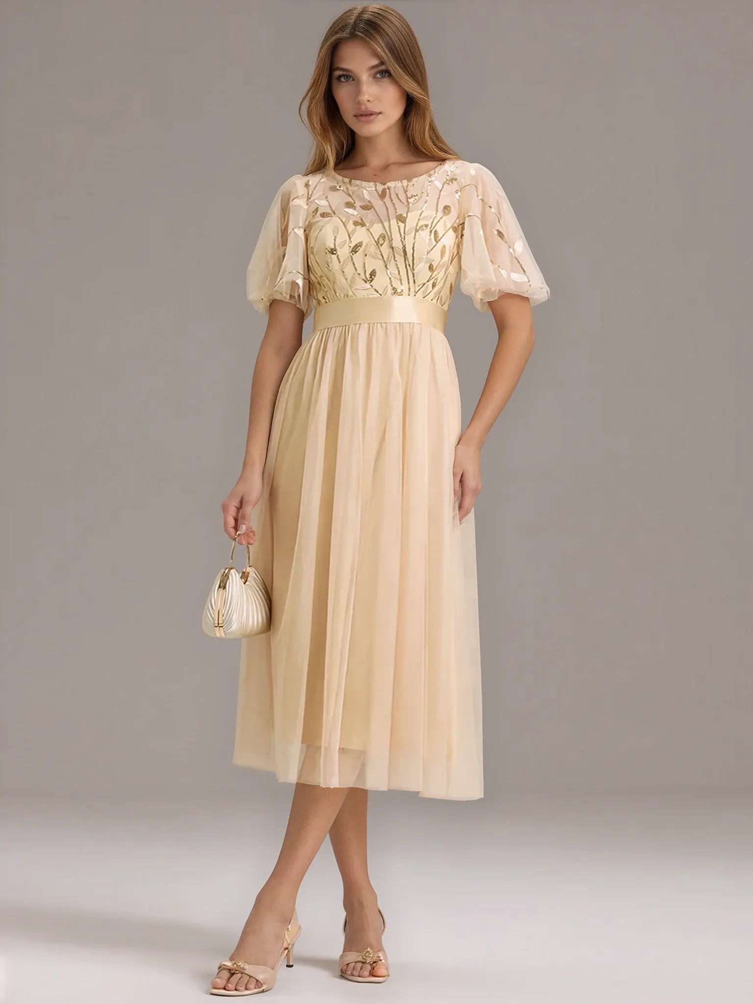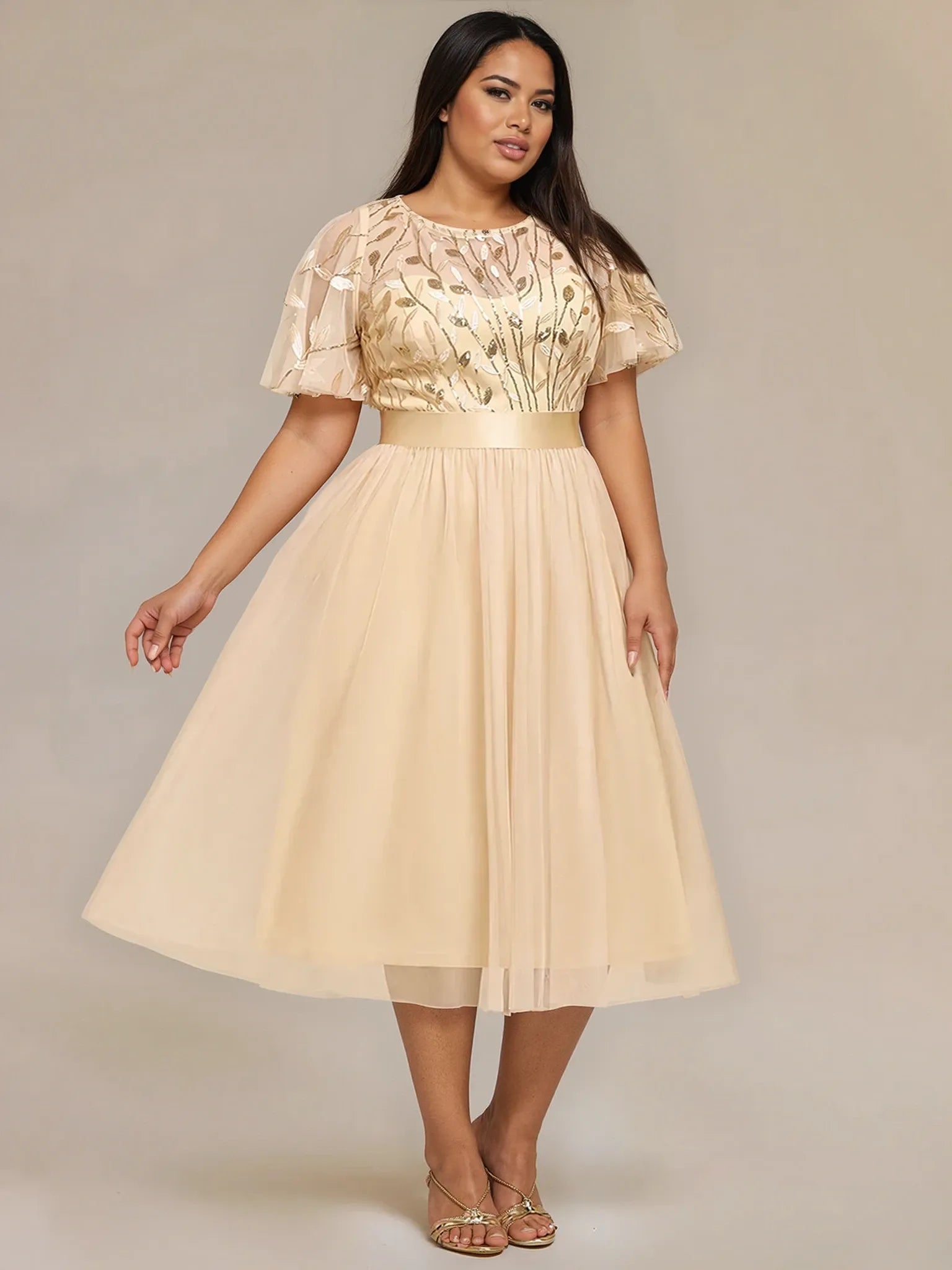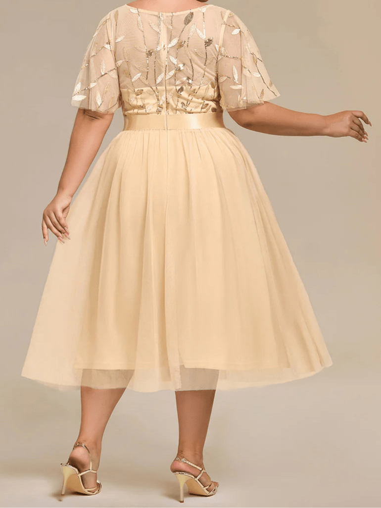 This elegant short-length gown is a top choice for mothers of the bride or groom. It features a hidden back zipper and is fully lined for comfort. The bodice is beautifully adorned with embroidered leaves and shimmering sequins, creating a radiant look. Wispy short flutter sleeves provide lovely coverage, while a stretchy waistband ensures a comfortable fit. The soft tulle skirt, complete with lining, adds a graceful finish. This dress makes it effortless to feel confident and beautiful on a special day.