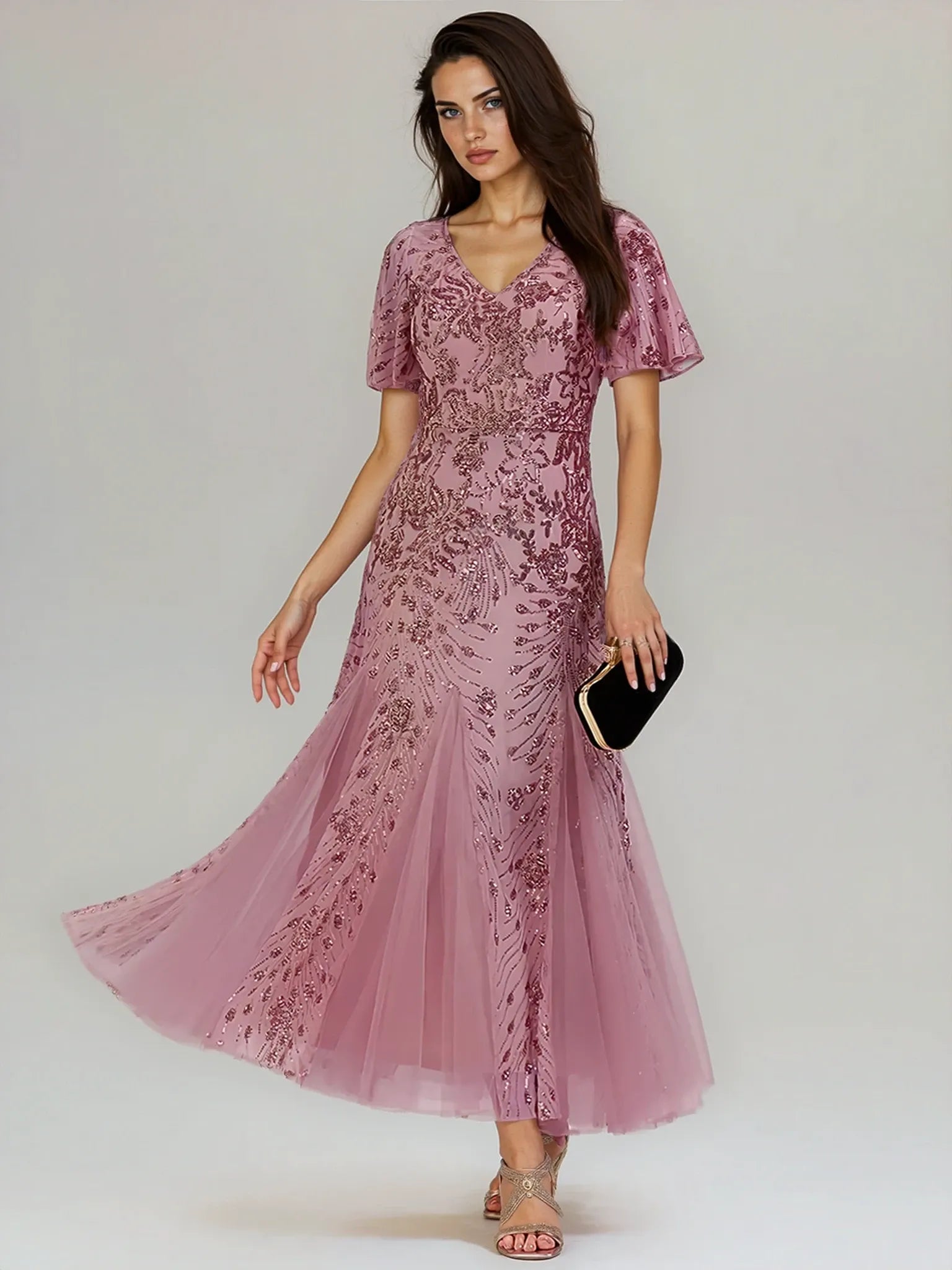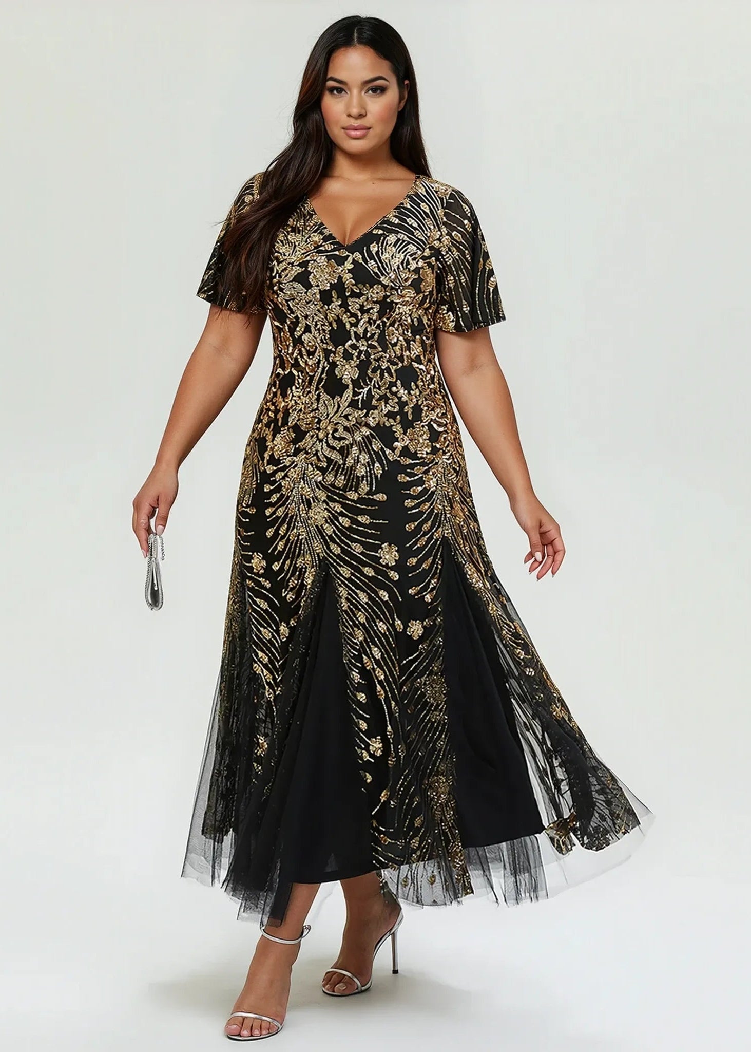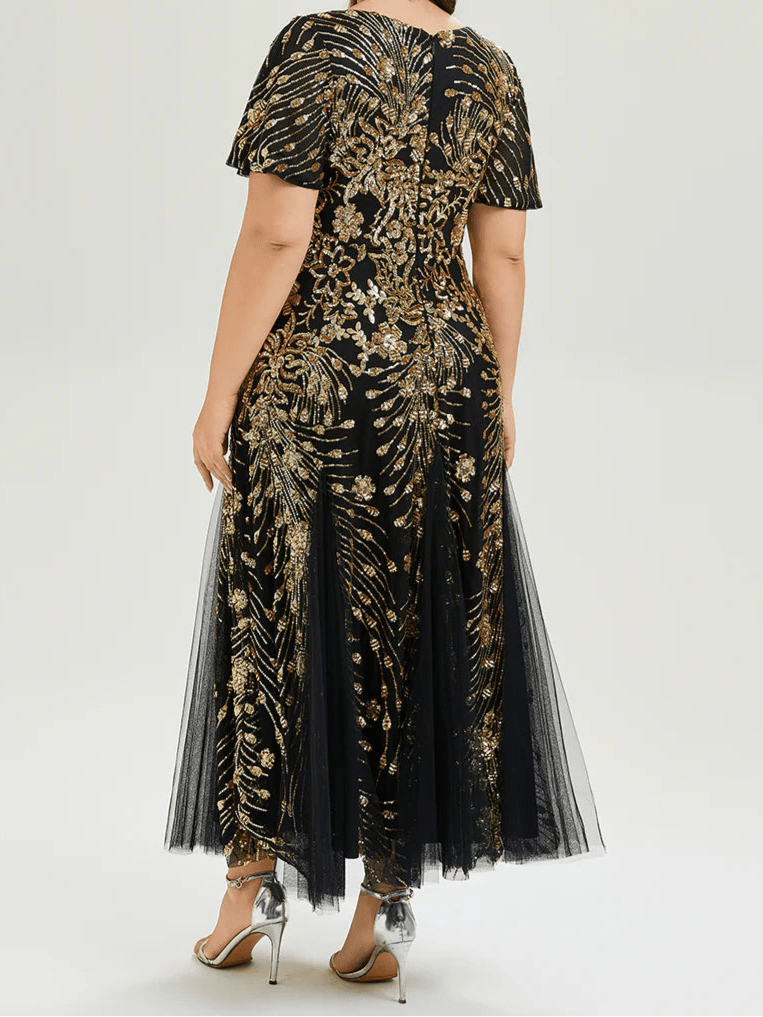 Elevate your special occasion with the Gina Midi Sequin Mother of the Bride/Groom Dress. Featuring a flattering V-neckline and a timeless strapless A-line silhouette, this dress enhances your natural shape effortlessly. Crafted from high-stretch sequin fabric, it offers both comfort and sparkle, moving gracefully as you do. Intricate embroidery and patchwork details add a unique touch, making it perfect for weddings, proms, or any formal event. With short sleeves, a back zipper, and a lined, non-padded design, this maxi-length dress ensures a stunning, comfortable fit. Consult the size chart to find your perfect match.