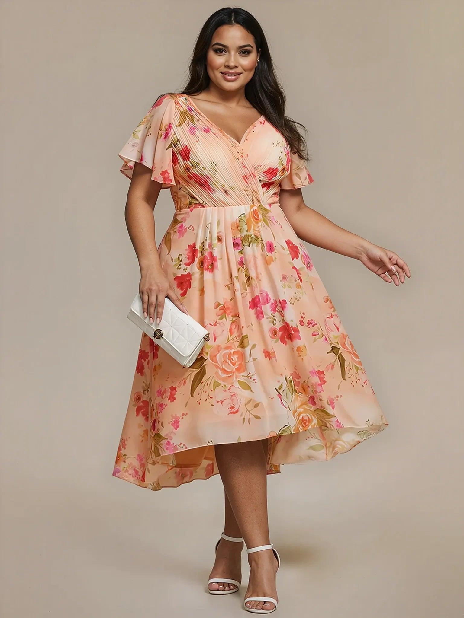 Divine shorter mother of the bride dress.  This gown can be easily dressed up or down. Loved for the arm coverage, V neckline and pleated skirt which flows over your tunny.  Also, a great length which won't need the extra cost of hemming.  It does up with a zip and is fully lined. Such a great option that can be dressed up or down so it can be worn again and again.