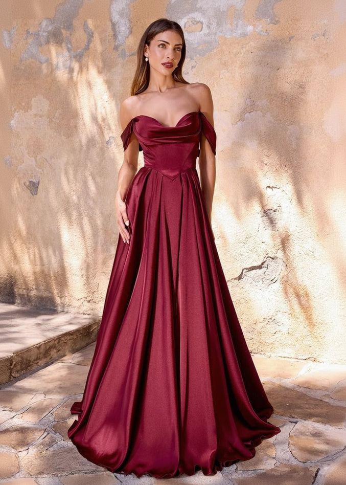 Meet our Erin Satin Basque Waist Ball or Bridesmaid Dress. Timeless romance with modern flair. Featuring a softly draped pleated neckline and delicate drop sleeves, the bodice is structured to flatter, while the full pleated skirt moves gracefully with every step. A front leg slit adds a subtle hint of allure, making this gown a dreamy choice for spring weddings, garden parties, or bridal celebrations.