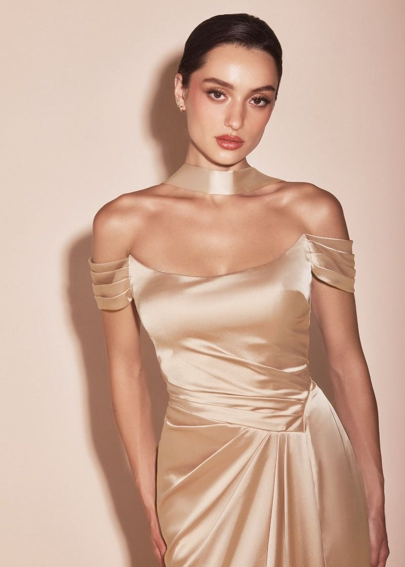 Meet the Lani Satin  Off the Shoulder Bridesmaid or Ball Dress. This fitted gown features an off-the-shoulder design with a gathered hipline and elegant leg slit, in a luxe satin. The structured boned bodice provides support, while the lace-up corset back can also wrap around the neck for a unique touch. Perfect for bridesmaids, wedding guests, or formal events, this dress offers both sophistication and allure.