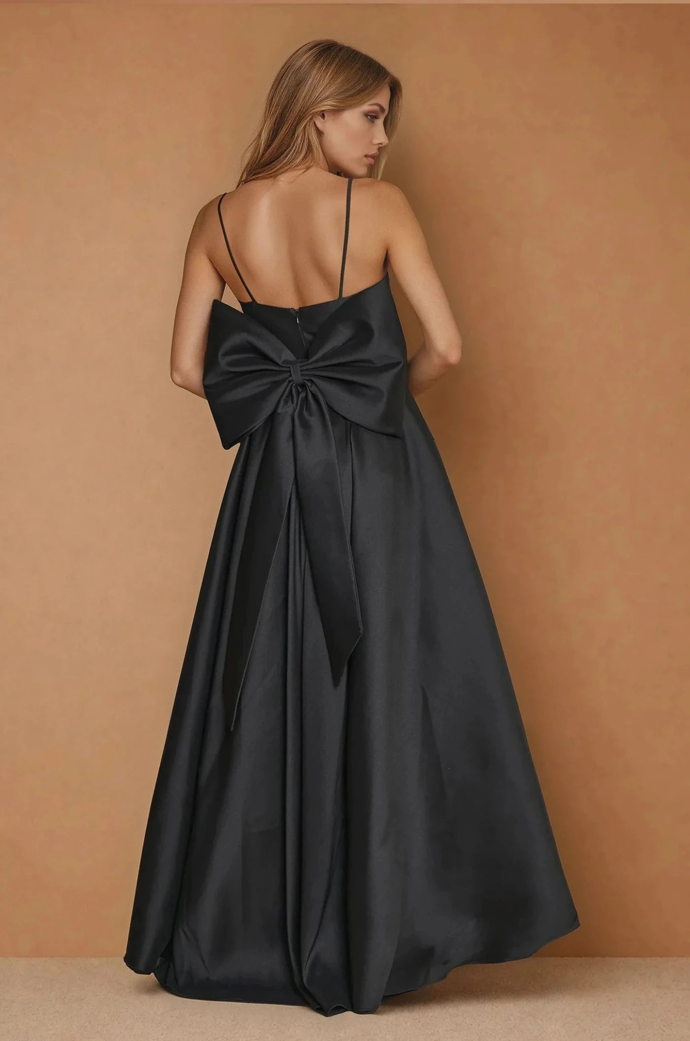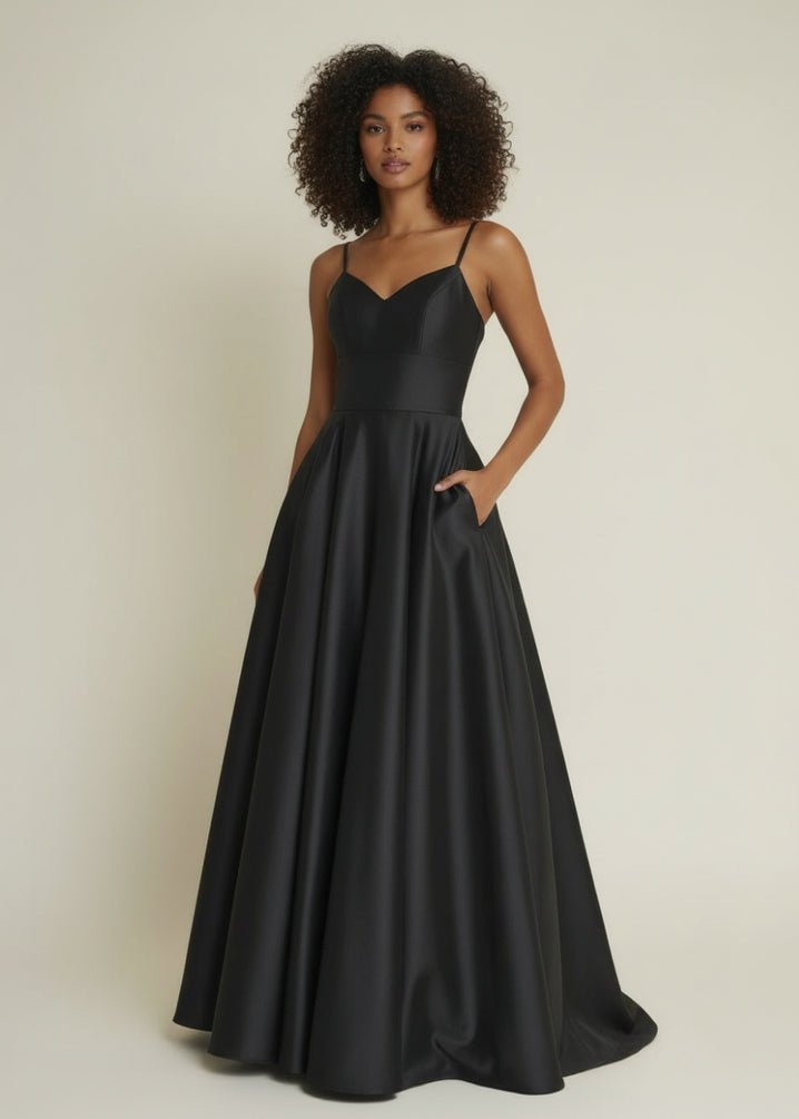 The Bonnie Black Satin Ball Dress with Bow combines structured and elegance with effortless comfort. Thin shoulder straps frame an open neckline while the fitted bodice shapes the bust and waist with smooth, supportive construction. The skirt flows into a full, floor-length silhouette with subtle pleating that adds graceful volume without heaviness. Soft, lustrous fabric maintains its shape throughout the evening, making this gown ideal for formal occasions where you want a defined upper fit paired with relaxed, wearable movement. Fully lined and has pockets and a detachable bow.