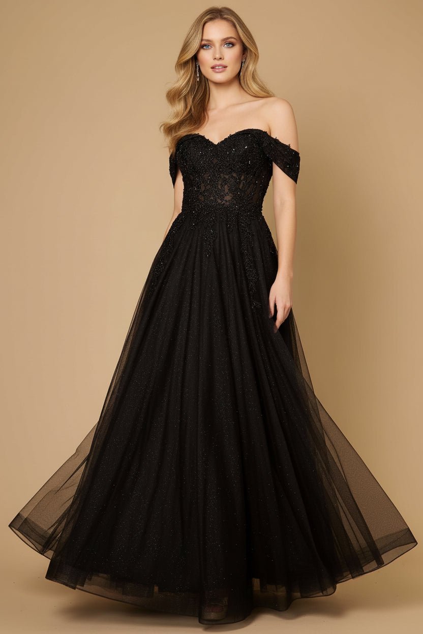 Introducing the Molly Strapless Sparkling Ball Dress in Black. An elegant choice for your most memorable moments. This stunning gown features a romantic off-shoulder corset bodice with a structured design that beautifully accentuates your silhouette, paired with a graceful A-line skirt that moves effortlessly. Delicate lace detailing adds a soft, feminine charm throughout. Just right for your upcoming school ball or evening out.