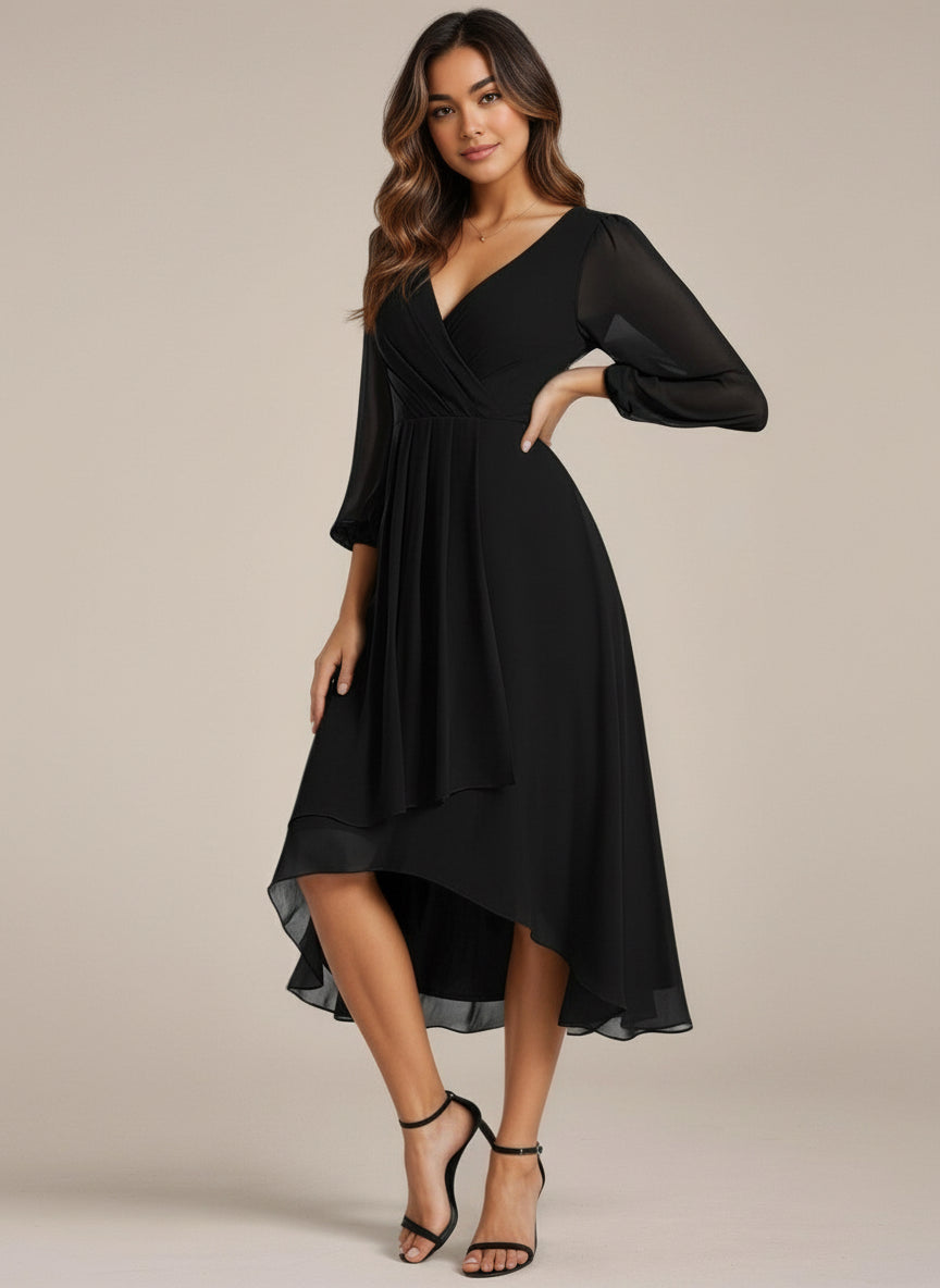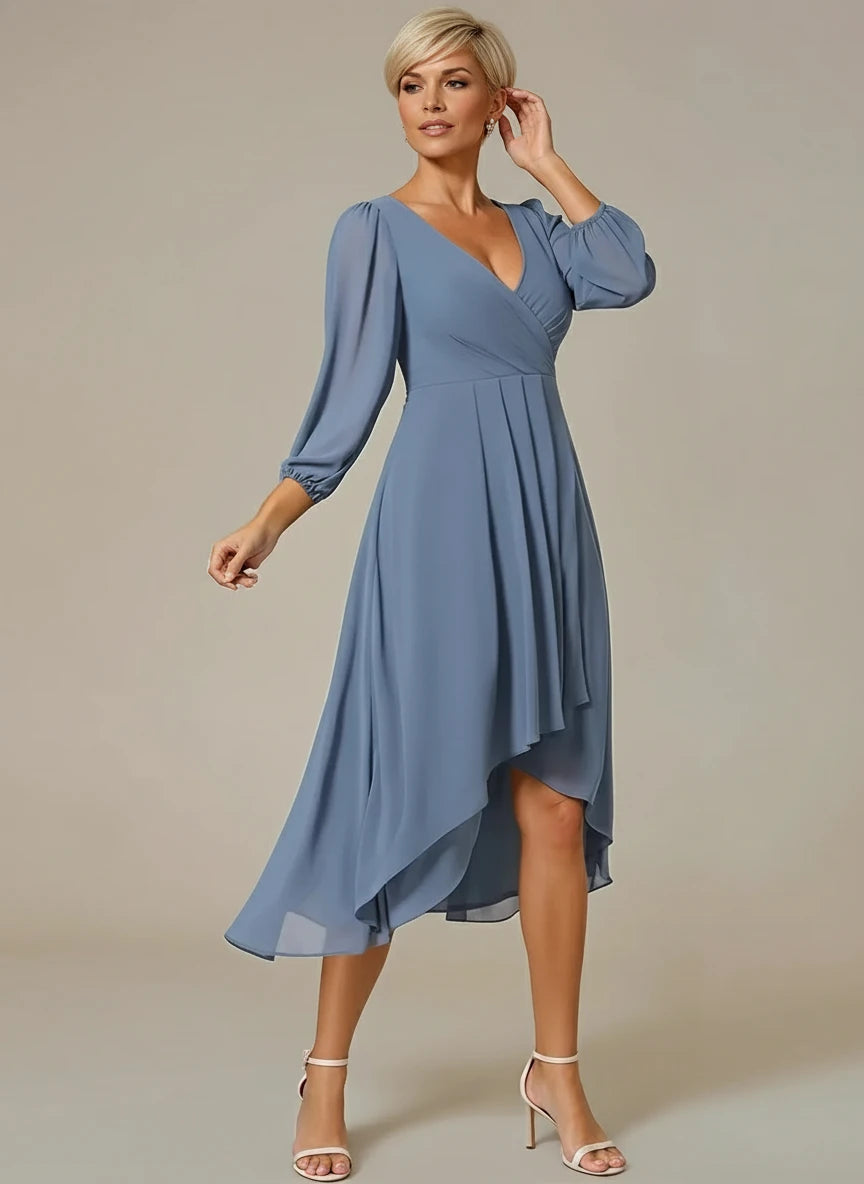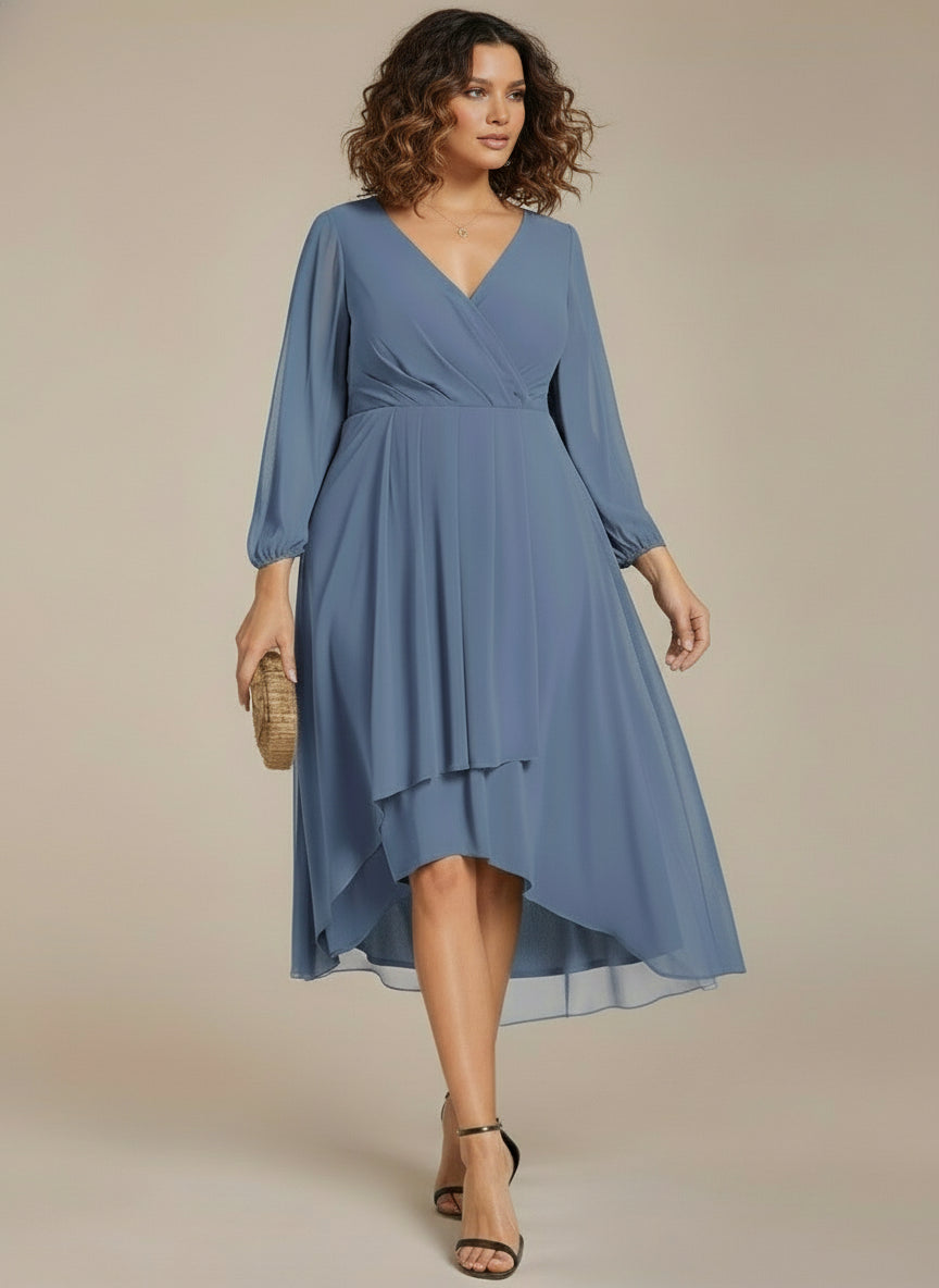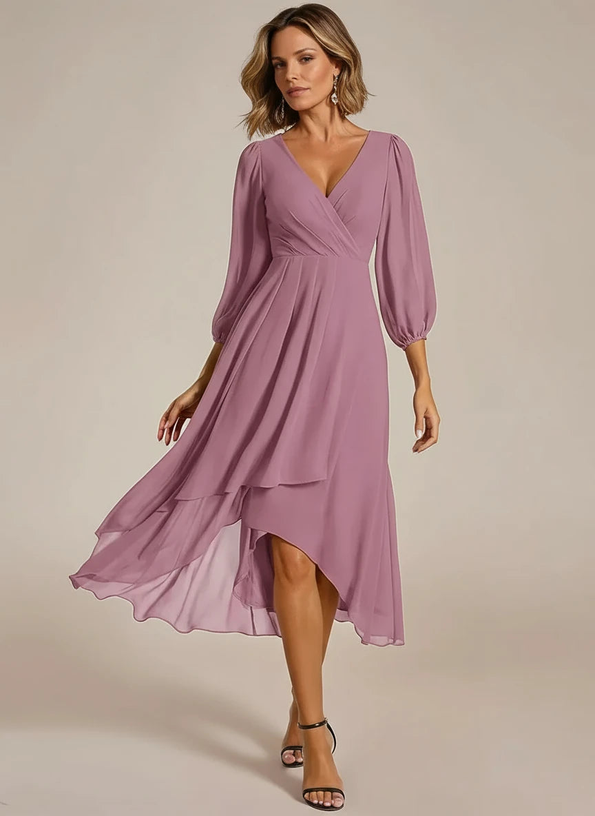 The Lovely Layered Chiffon V-Neck Gown is an elegant choice for any wedding guest or Mother of the Bride/Groom looking for comfort, class, and timeless style — a beautiful investment piece for your next special occasion.