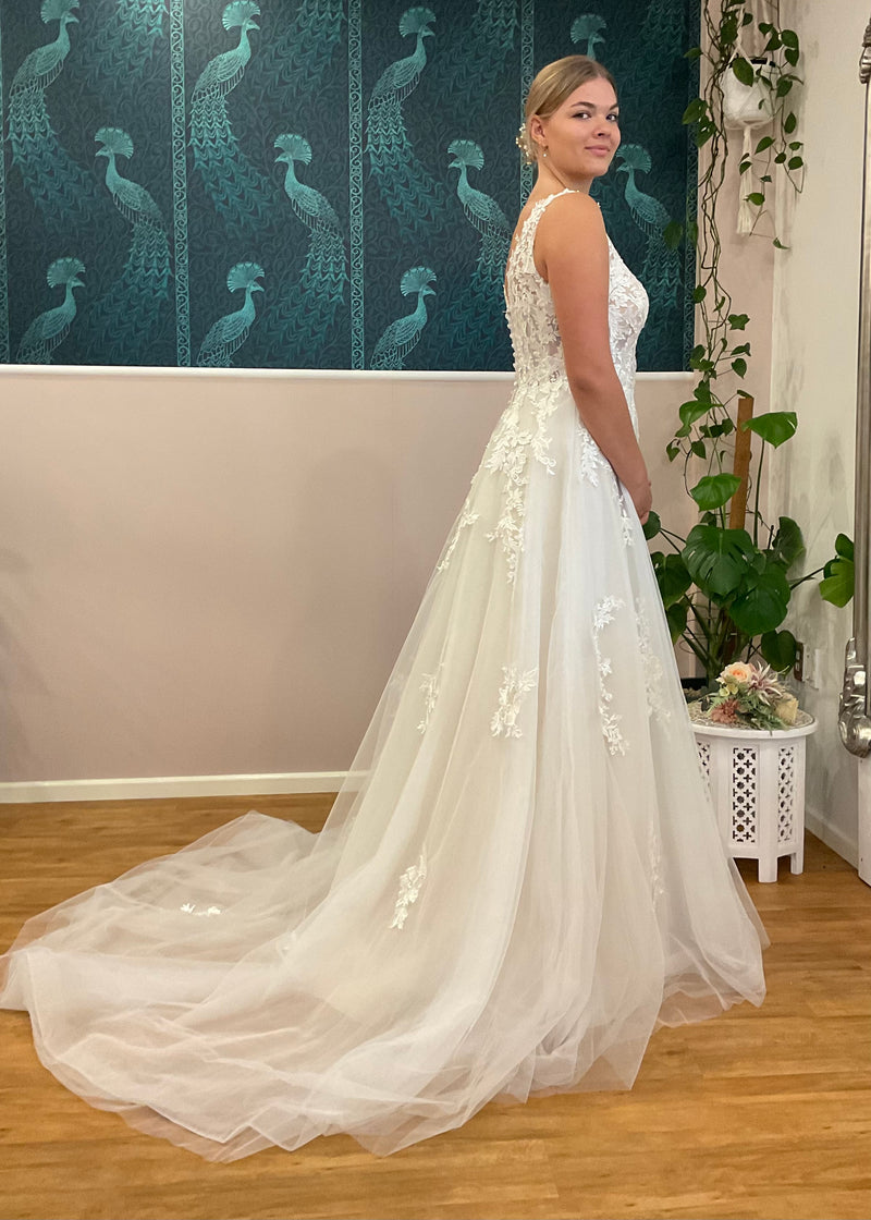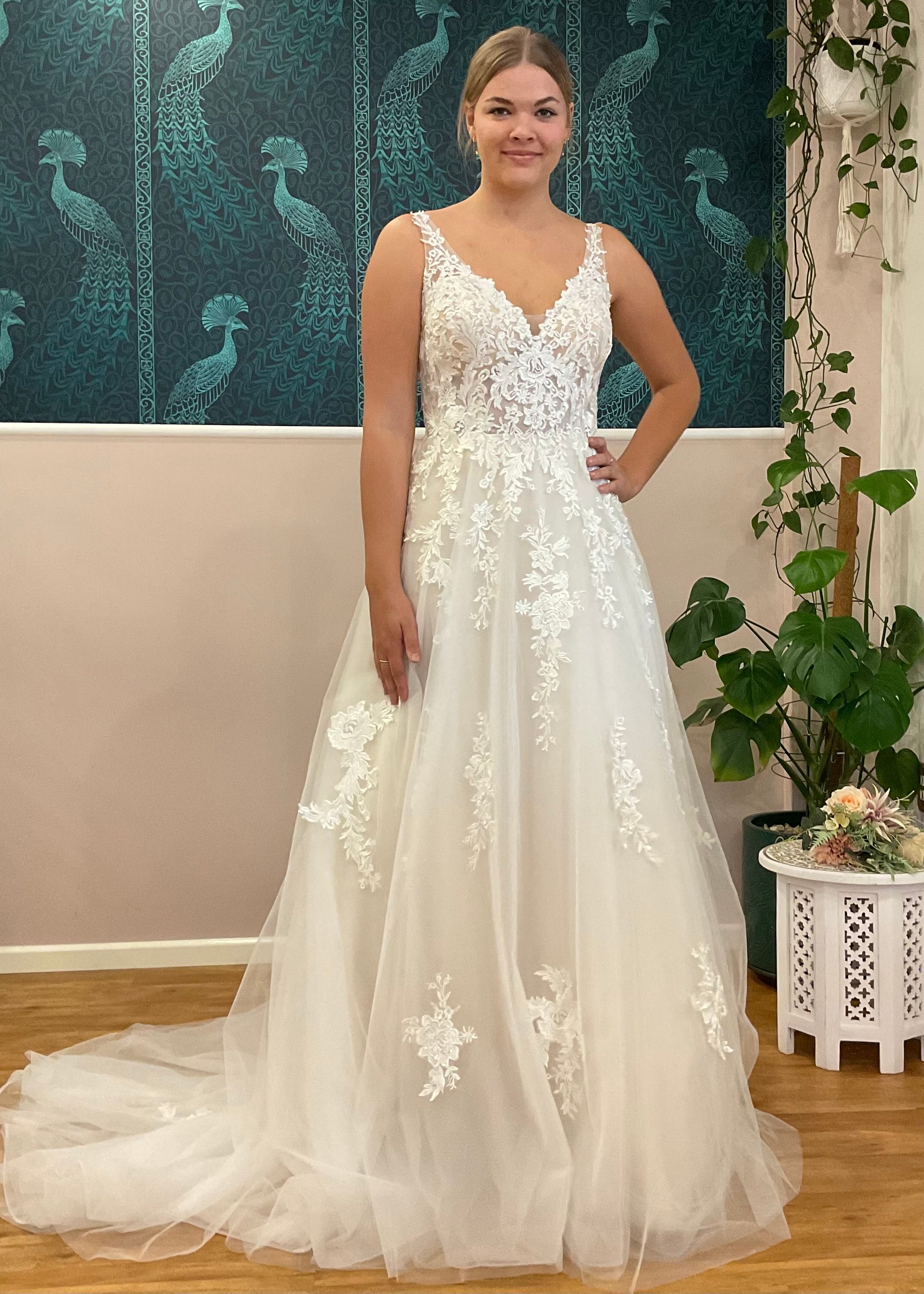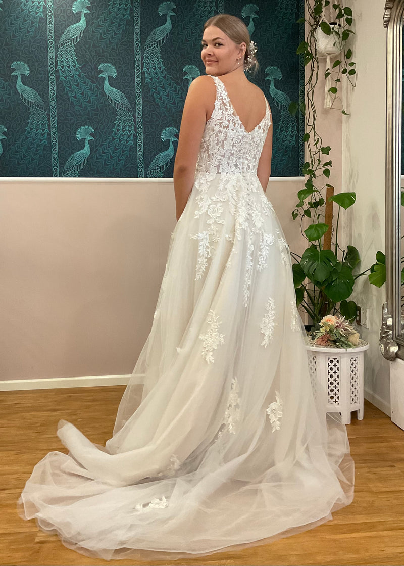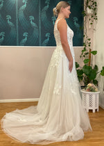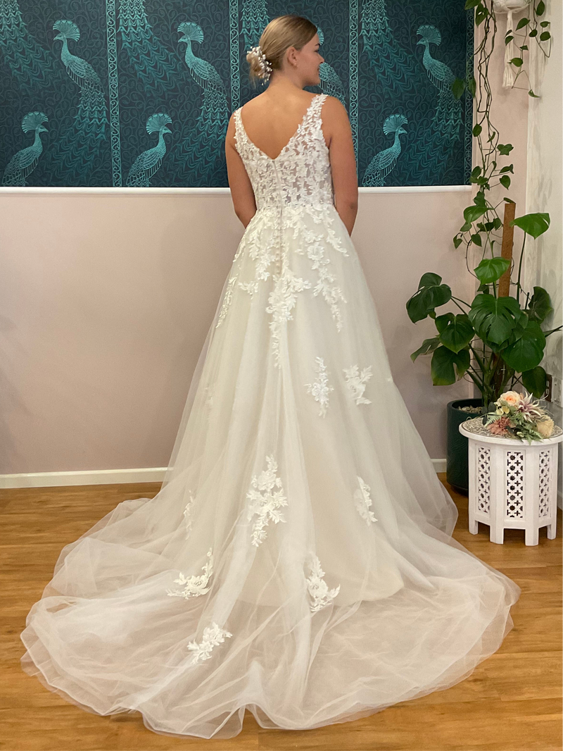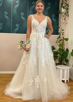 The wedding dress has a V-neckline with an a-line skirt with train. In a stunning Ivory with a satin champagne underlay, this wedding dress features flower appliqués on the skirt, bodice and straps. It is breathtakingly beautiful. An added feature of this particular gown is that the satin underlay extents to the outer train length, and it also has a sparkle tulle underlay for extra bling. (please note, images are showing ivory on champagne, not ivory on ivory. Please visit our store to see the ivory on ivory version - correct images coming soon)