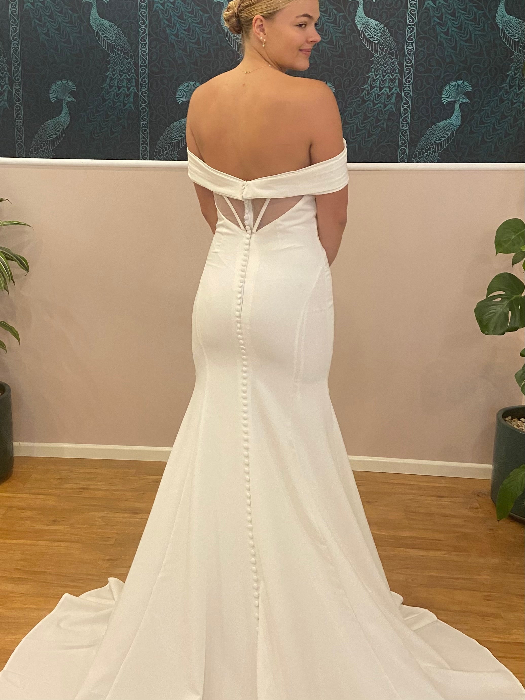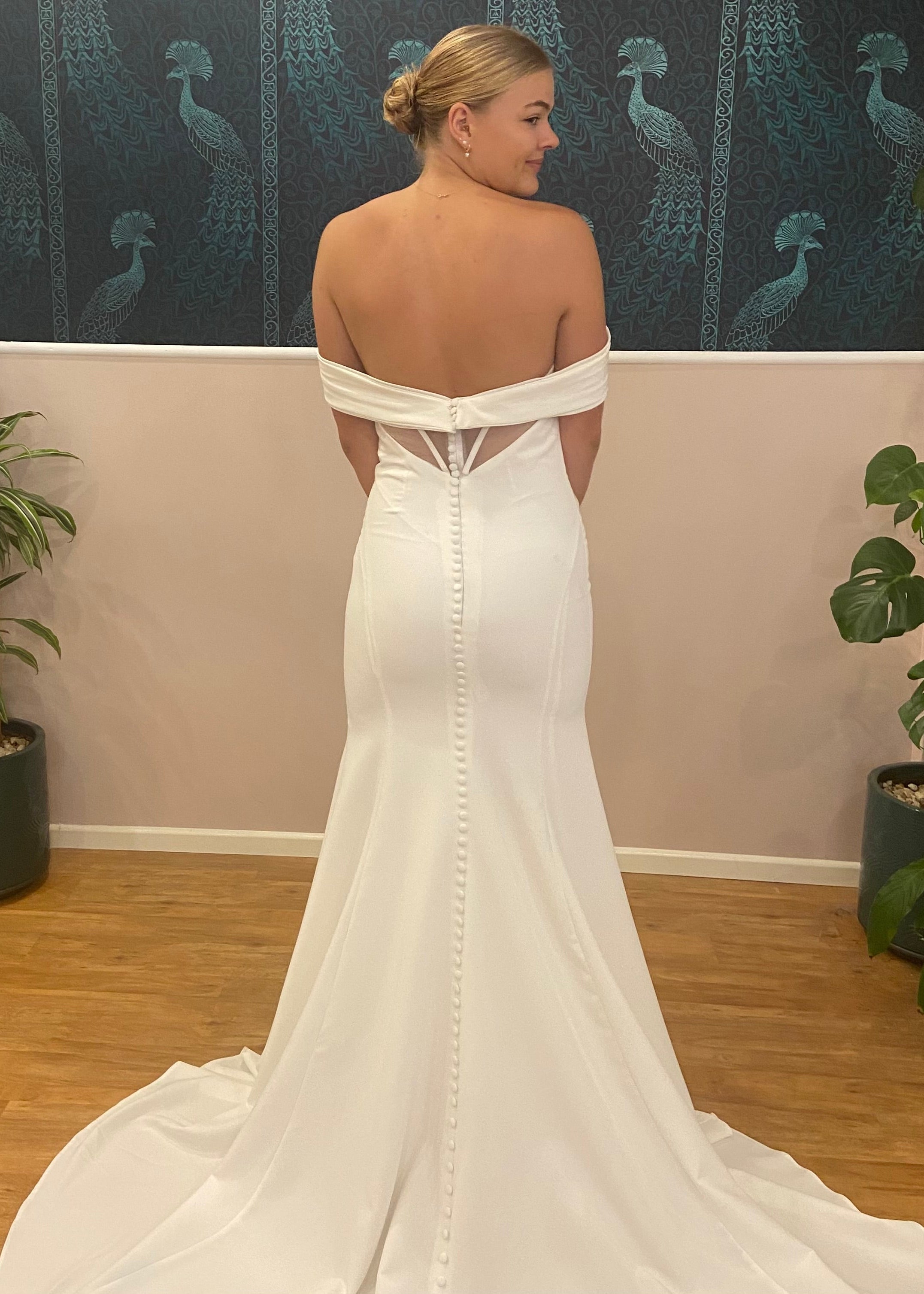 The Susan Ivory wedding gown exudes elegance and sophistication. Its curve-hugging fit and flare design, made of luxurious crêpe fabric, is accentuated by a pleated corset bodice. The detachable off-shoulder sleeves add a touch of modernity to this timeless piece.