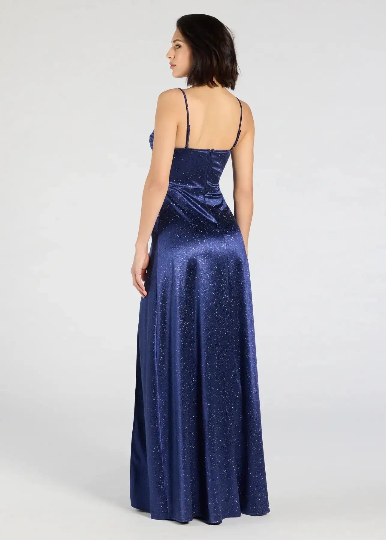 Check out our glamerous Satin Sparkle Ball Dress in navy.  This Jenny glitter satin formal dress features a pleated cowl neckline and dramatic high-cut slit that elevates the floor-sweeping A-line silhouette. Dripping in luxurious satin with an irresistible silky shine, this gown turns heads effortlessly at any black-tie affair. Perfect for those who want to make a sophisticated statement with timeless elegance and understated glamour.