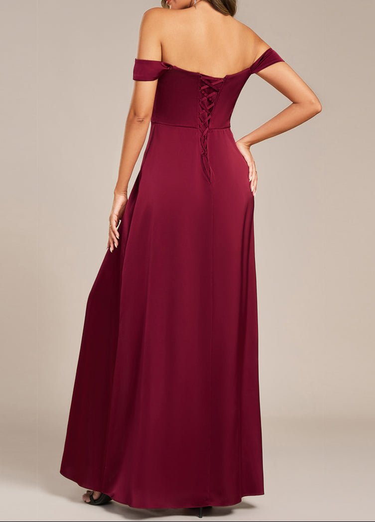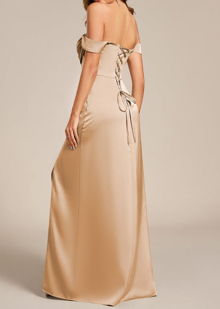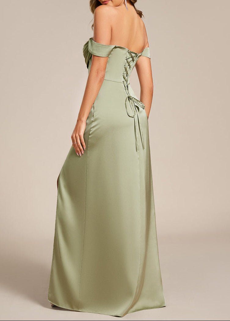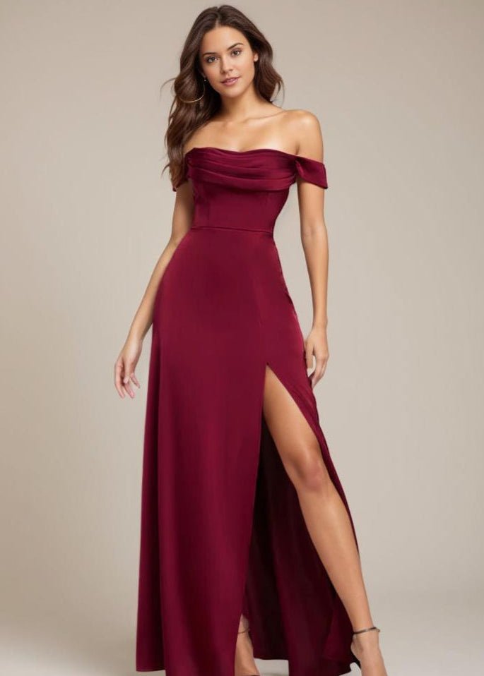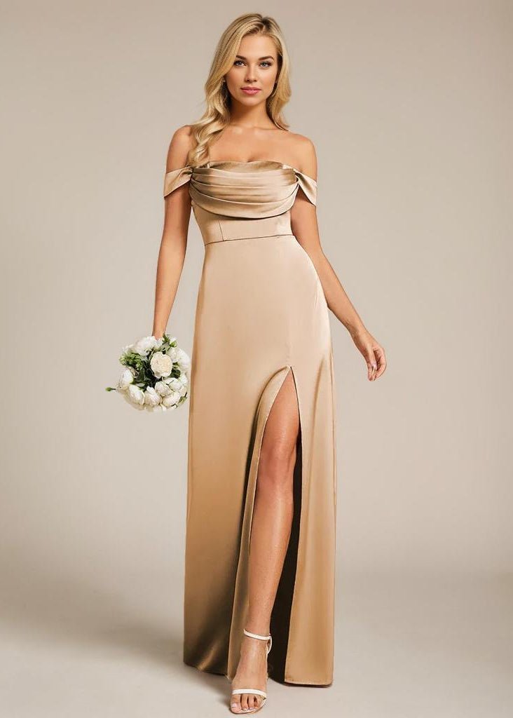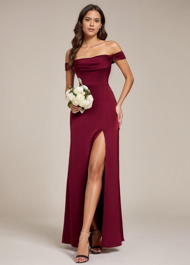 Cynthia off shoulder satin bridesmaid dress with split