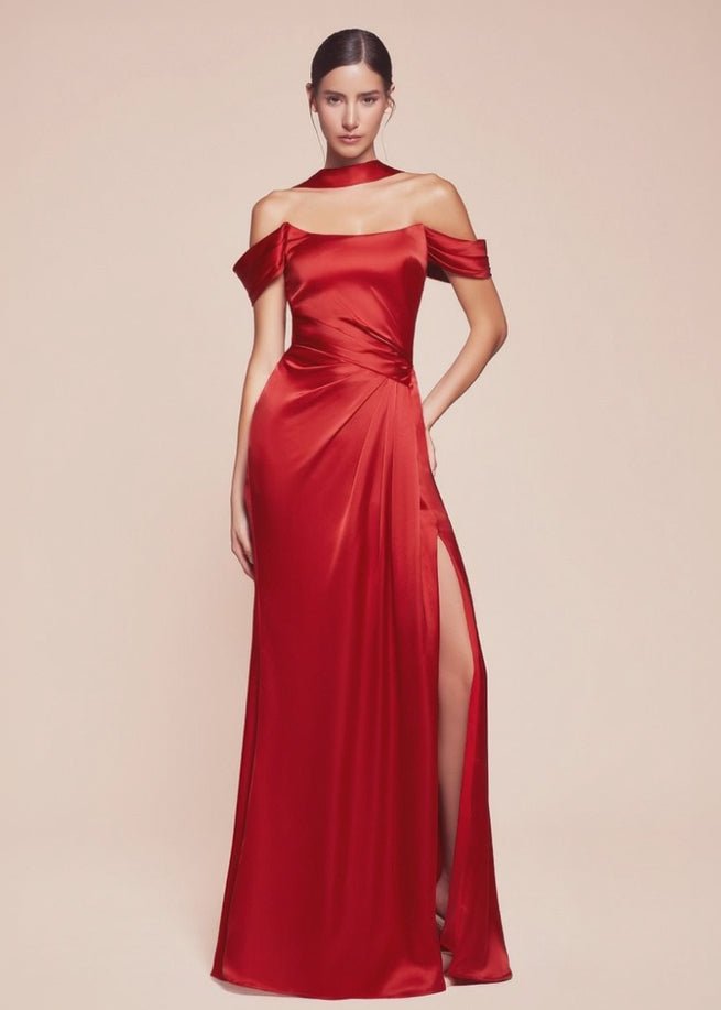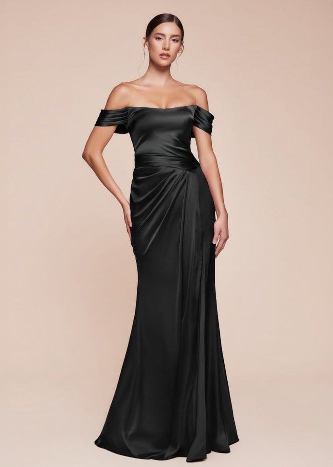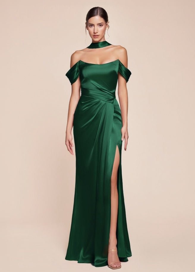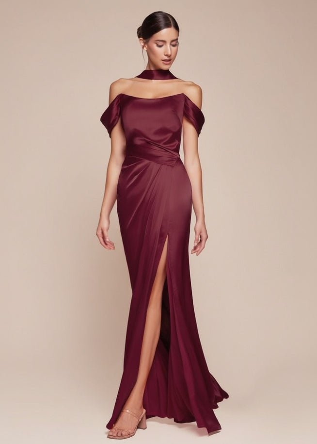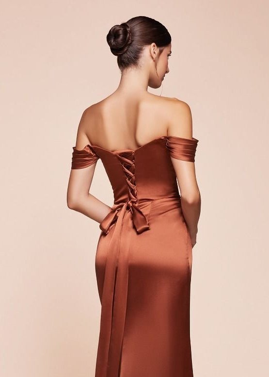 Meet the Lani Satin  Off the Shoulder Bridesmaid or Ball Dress. This fitted gown features an off-the-shoulder design with a gathered hipline and elegant leg slit, in a luxe satin. The structured boned bodice provides support, while the lace-up corset back can also wrap around the neck for a unique touch. Perfect for bridesmaids, wedding guests, or formal events, this dress offers both sophistication and allure.