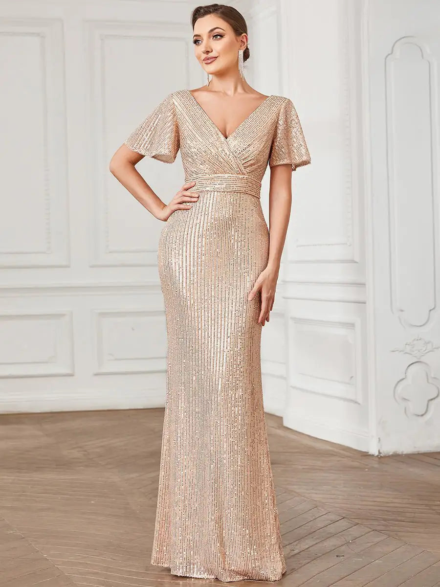 Meet the Carolina Sequin Ball Dress with Sleeves Size 8. This gown is great for a number of occasions including Mother of the Bride or Groom. With lovely fltter short sleeve.  This gown is suitable for wearing a bra amd is cinched in at the waist and fitted around the hips.  In a stretch fabric, look fabulous in this sequined evening ball gown and shine on your night out. This gown is lined and does up with a back zip.  It is not padded in the bust.