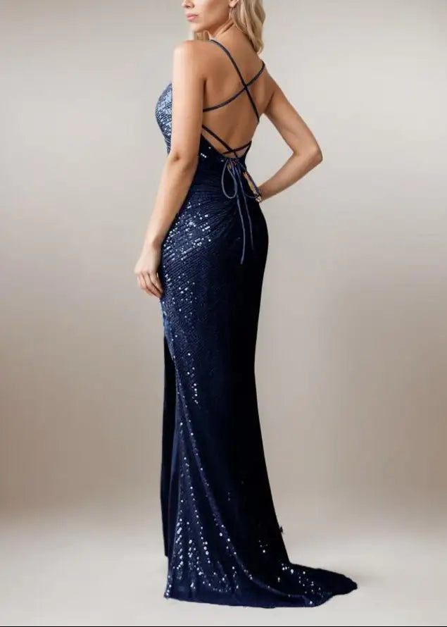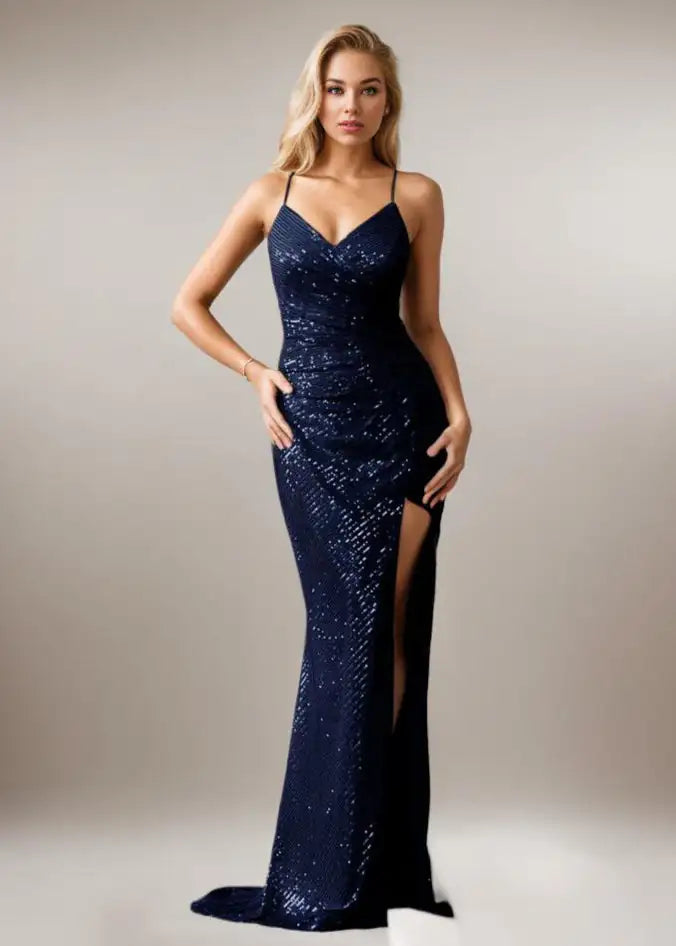 Meet our Denise Navy Sequin Ball Dress with Lace Up Back. This elegant navy sequined spaghetti strap evening dress has an ever popular V-neck and slit. The slit sits open, and the gown has ruching all along the side, which is super flattering. It does up at the back with an open lace up back and looks amazing on. Now just to choose the colour you love the most. It is also lined and has a fishtail train. So elegant for your school ball or evening out.