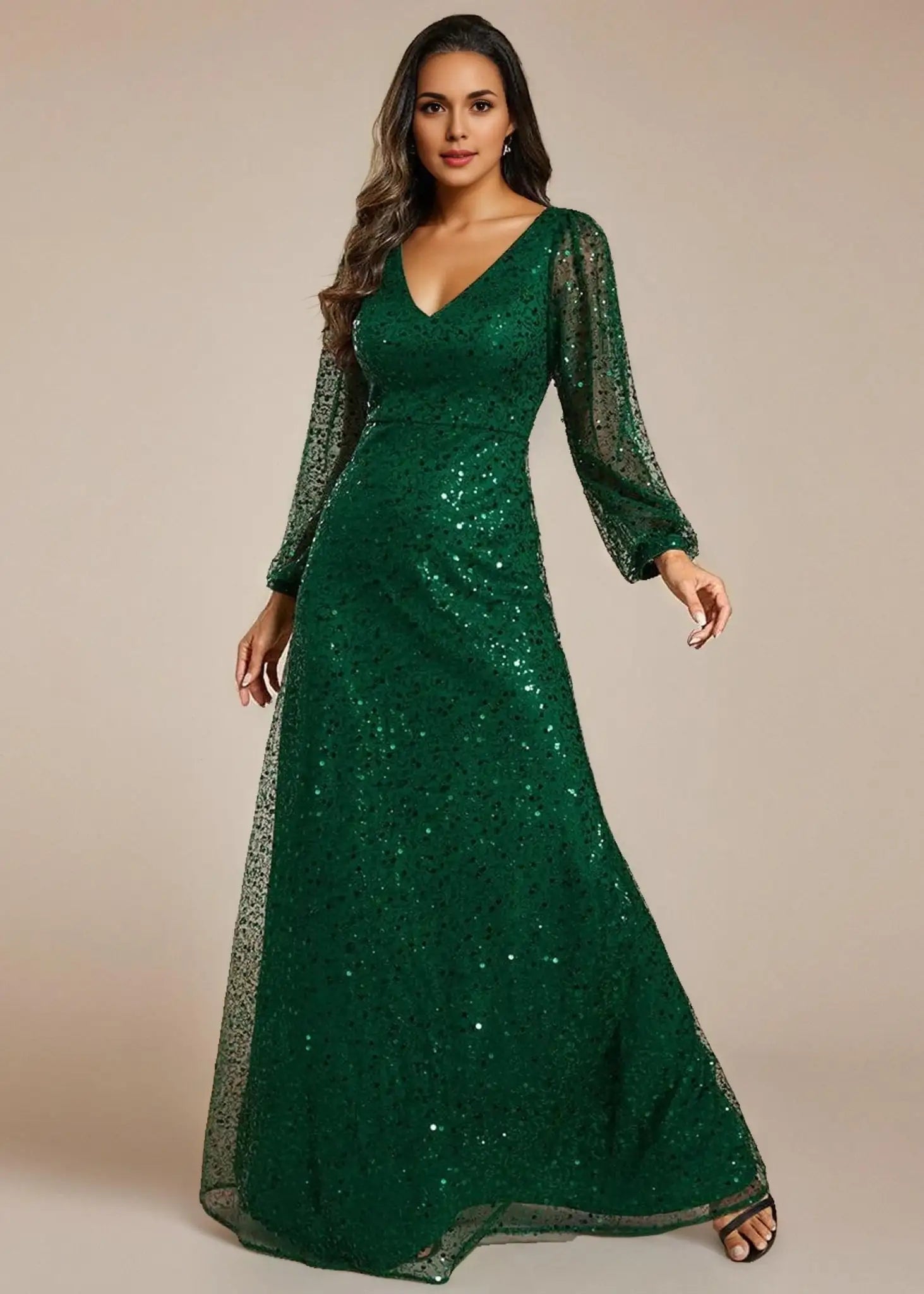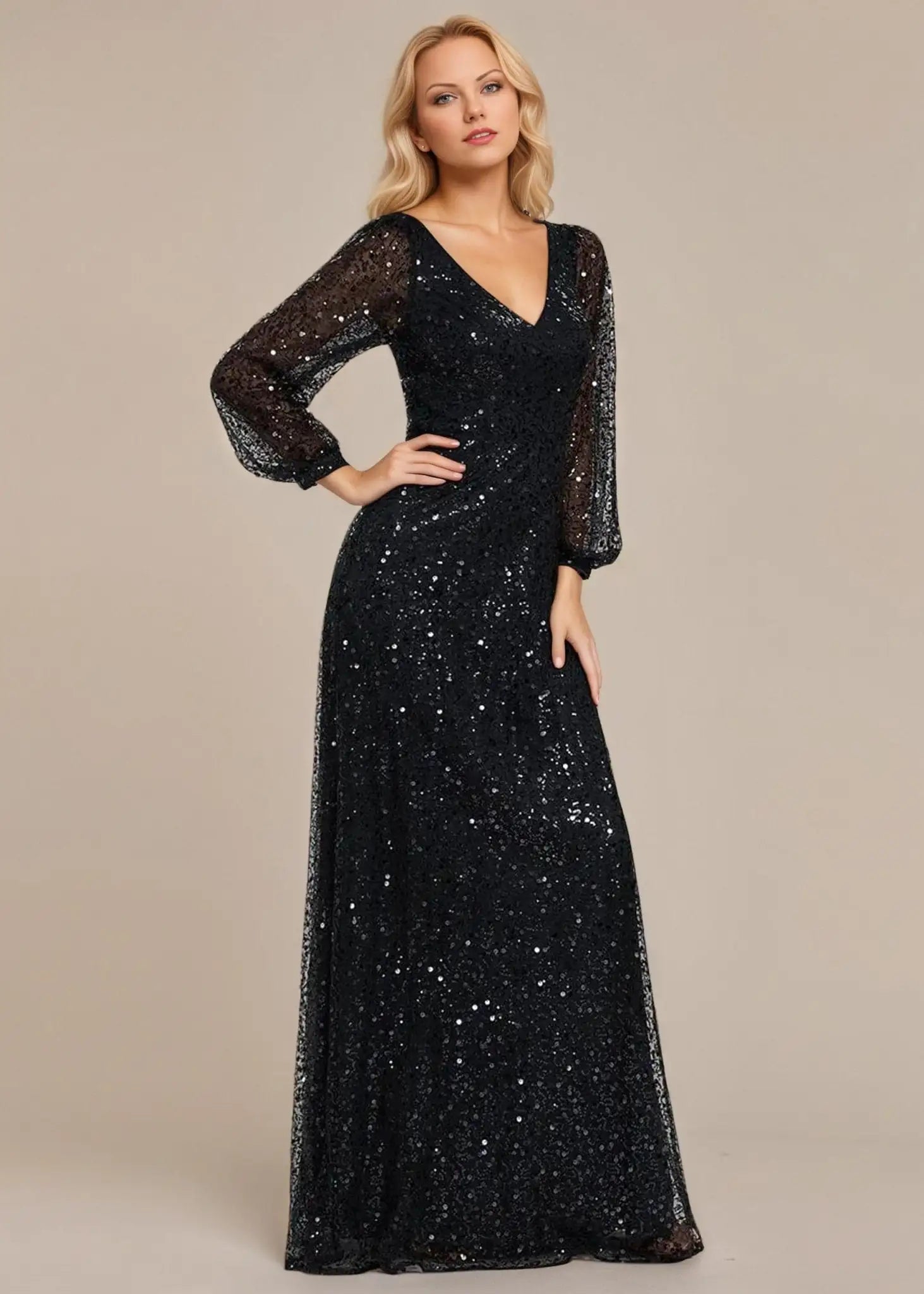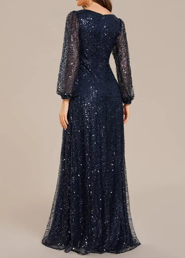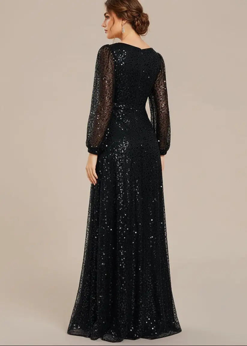 Prepare to shine in the limelight and captivate the crowd with this stunning shimmering All over V-Neck long lantern sleeve sequin A-Line Evening Dress. Its dazzling sequins and sophisticated A-line design make it the perfect option for elegant evening events, red carpet premieres, or glamorous black-tie affairs. This gown does up at the back and is fully lined. It is padded in the bust for a no bra option but can also be worn with a bra.