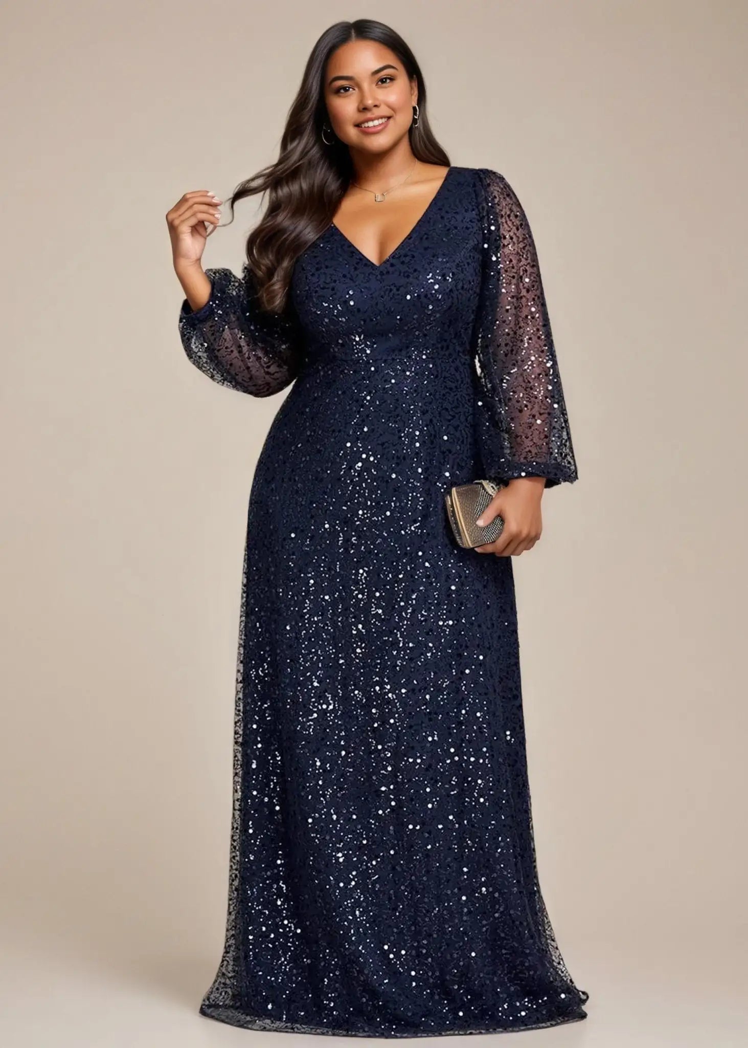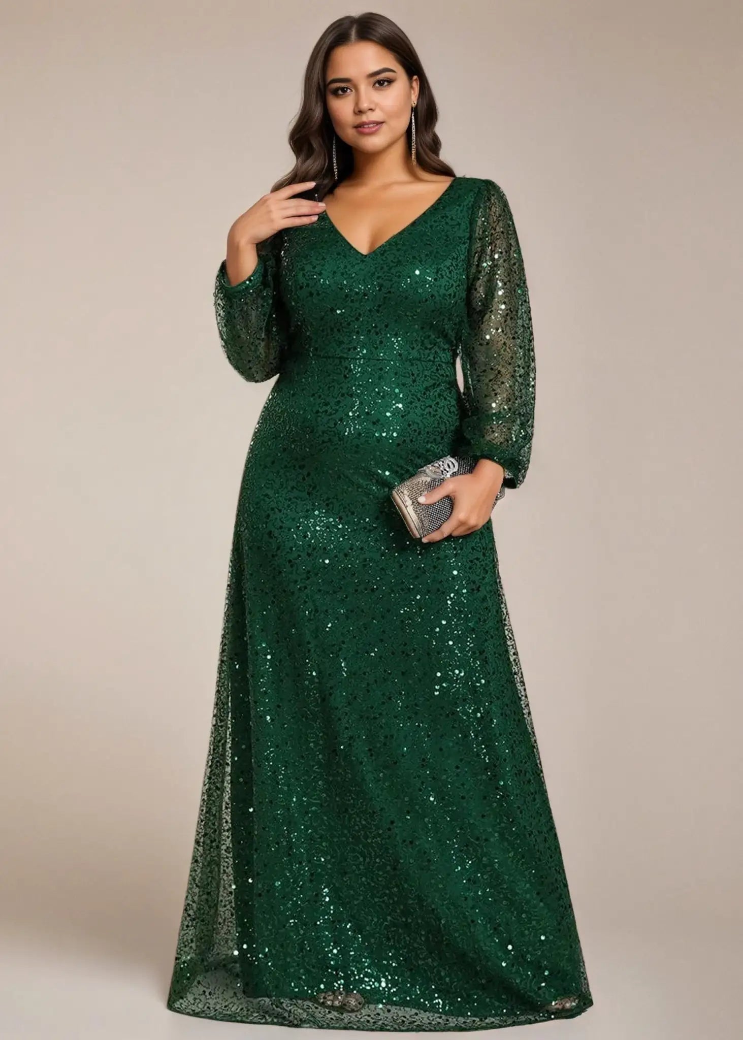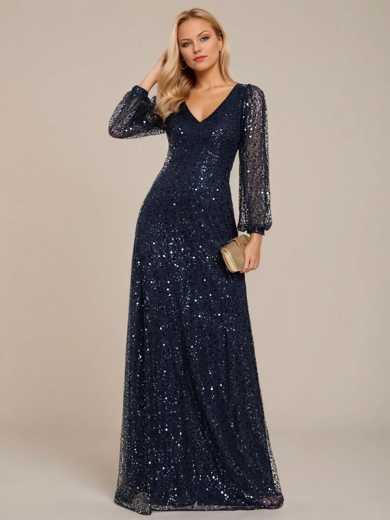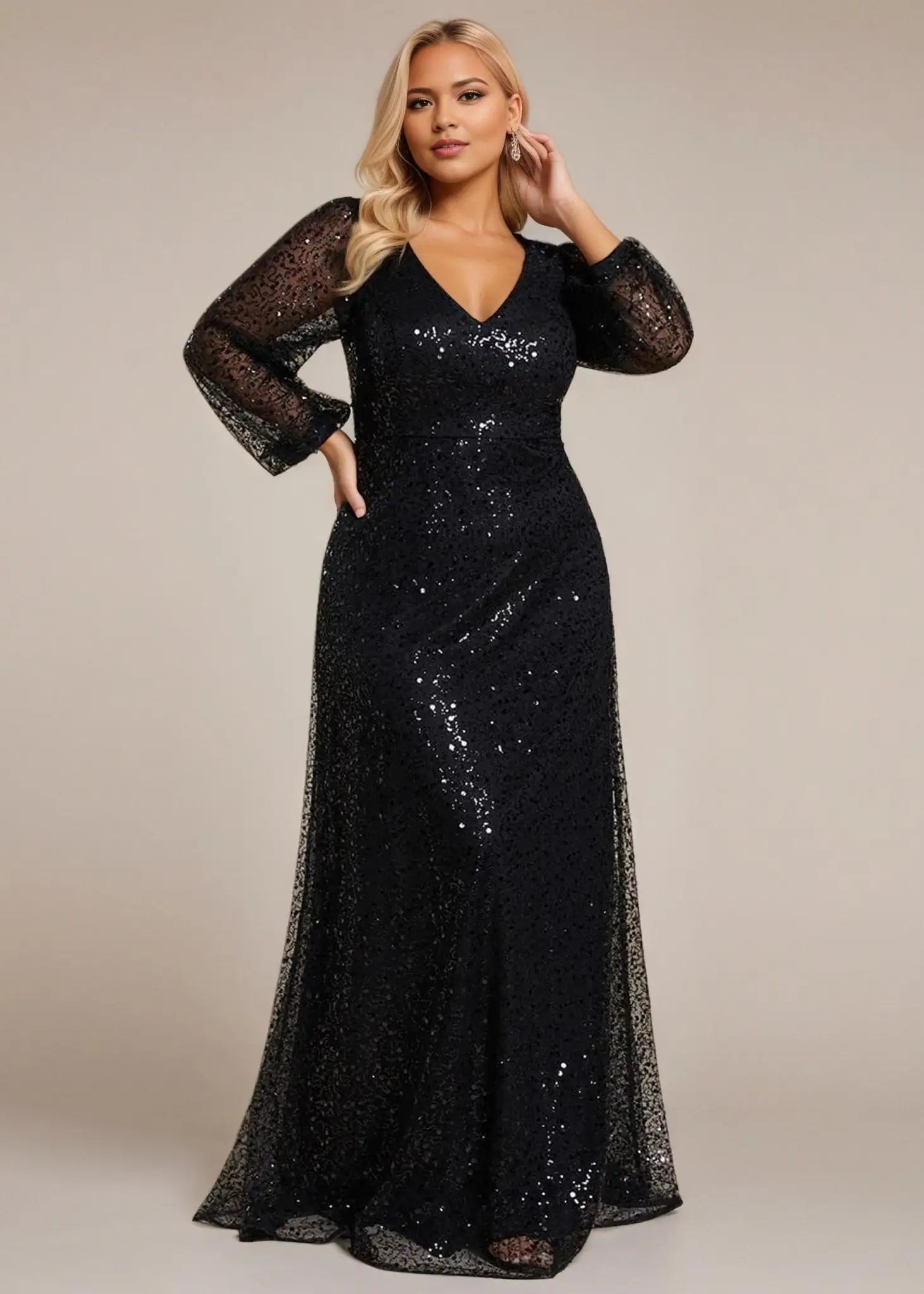 Prepare to shine in the limelight and captivate the crowd with this stunning shimmering All over V-Neck long lantern sleeve sequin A-Line Evening Dress. Its dazzling sequins and sophisticated A-line design make it the perfect option for elegant evening events, red carpet premieres, or glamorous black-tie affairs. This gown does up at the back and is fully lined. It is padded in the bust for a no bra option but can also be worn with a bra.