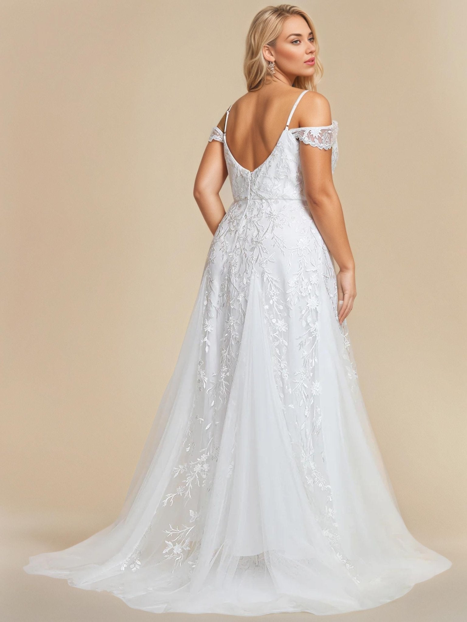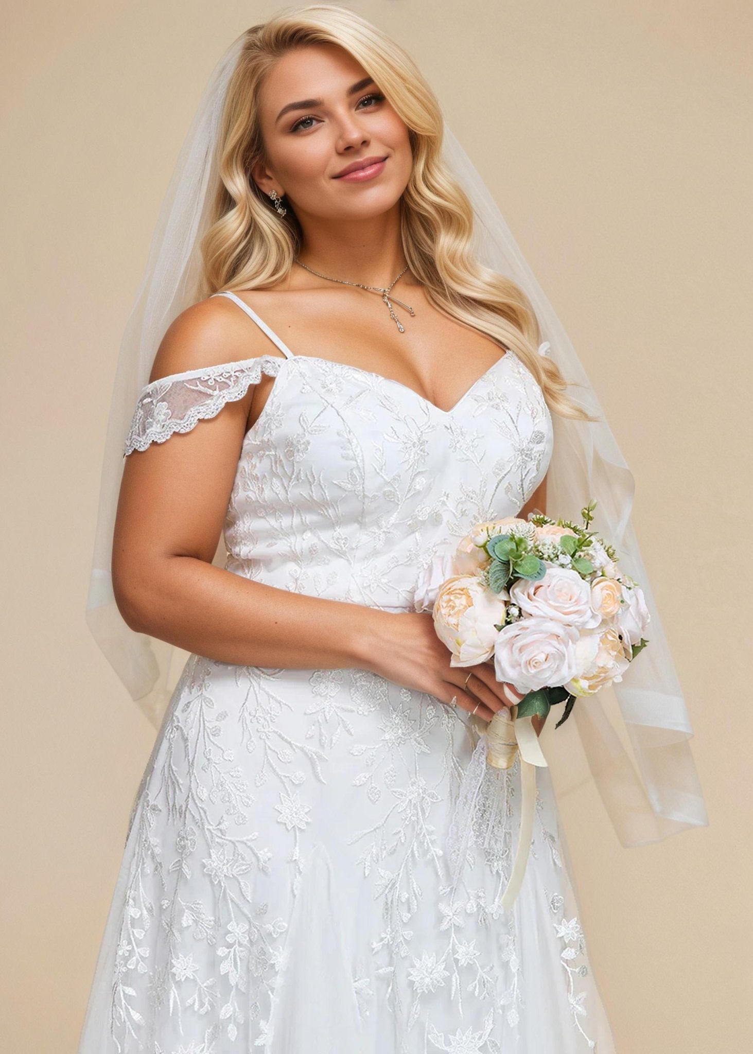 This elegant Harmony A-line wedding gown features a flattering V-neck and drop sleeves, designed to enhance comfort and style. It is a non-stretch fit with delicate embroidery details. The floor-length silhouette includes padded support, and adjustable spaghetti straps for a personalised fit. A strapless bra can be worn with this gown if needed. A concealed back zipper ensures a seamless look. Ideal for weddings, this gown combines sophistication with plus-size curvy friendliness, making it a great choice for your special day.