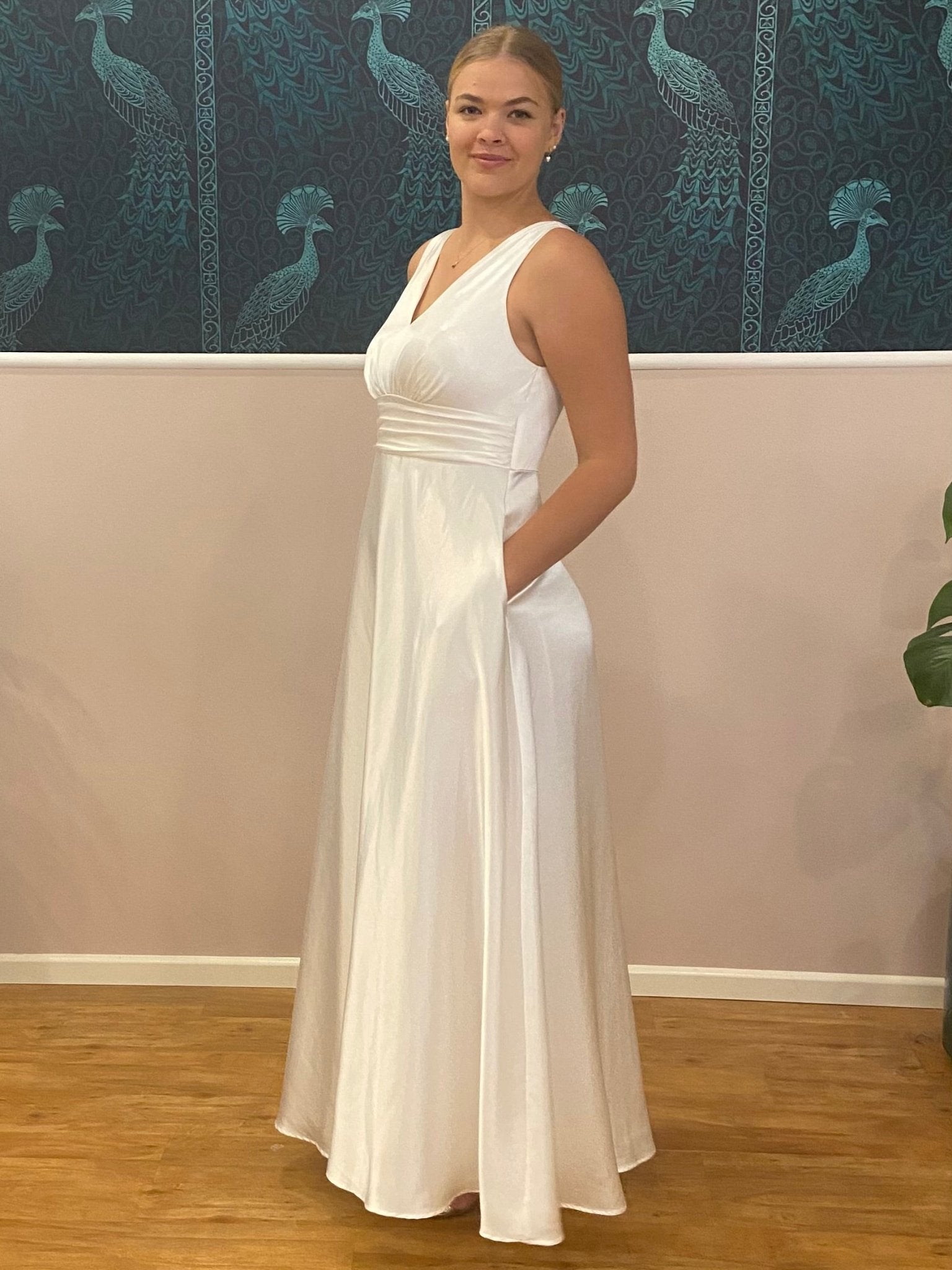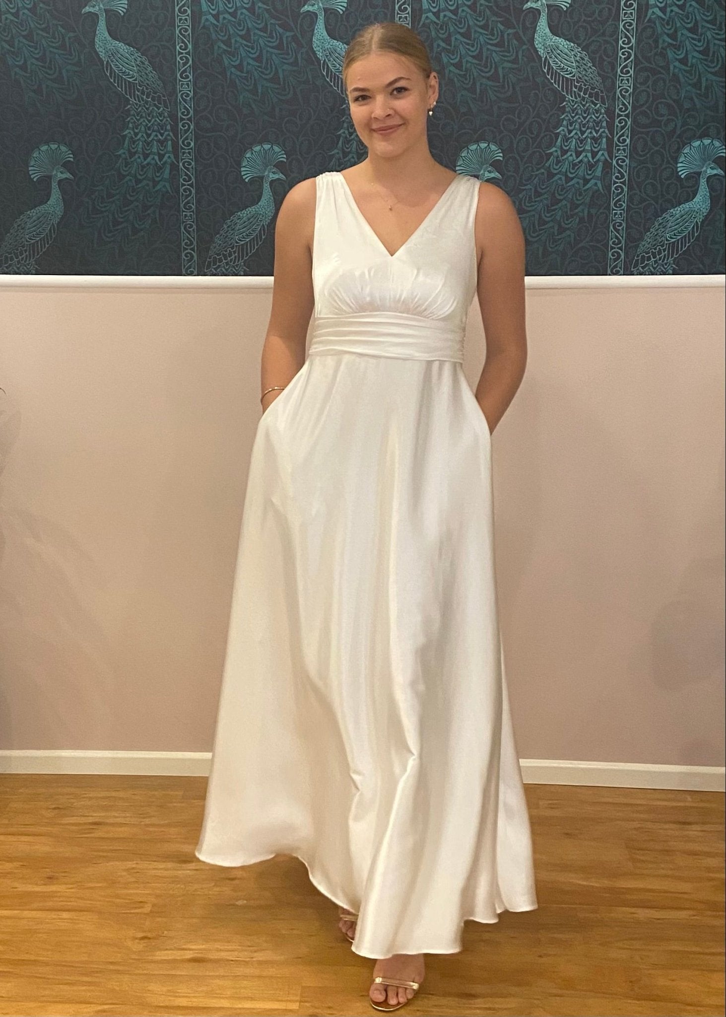Sleek minimalist classic A-Line wedding gown. This gown does up with a back zip and has an A-line skirt and pockets.  With a V neckline at the front and the back and an even hemline.  Perfect for our kiwi brides to dance the night away and not need to change gowns. A bra can be worn with this gown and its sheen is just divine.